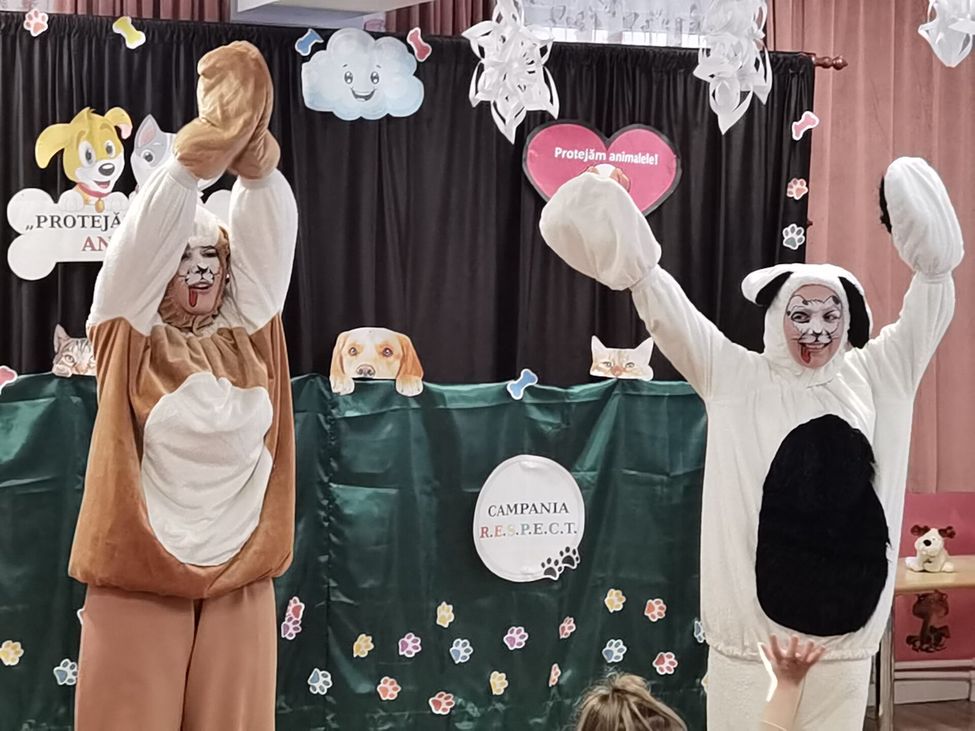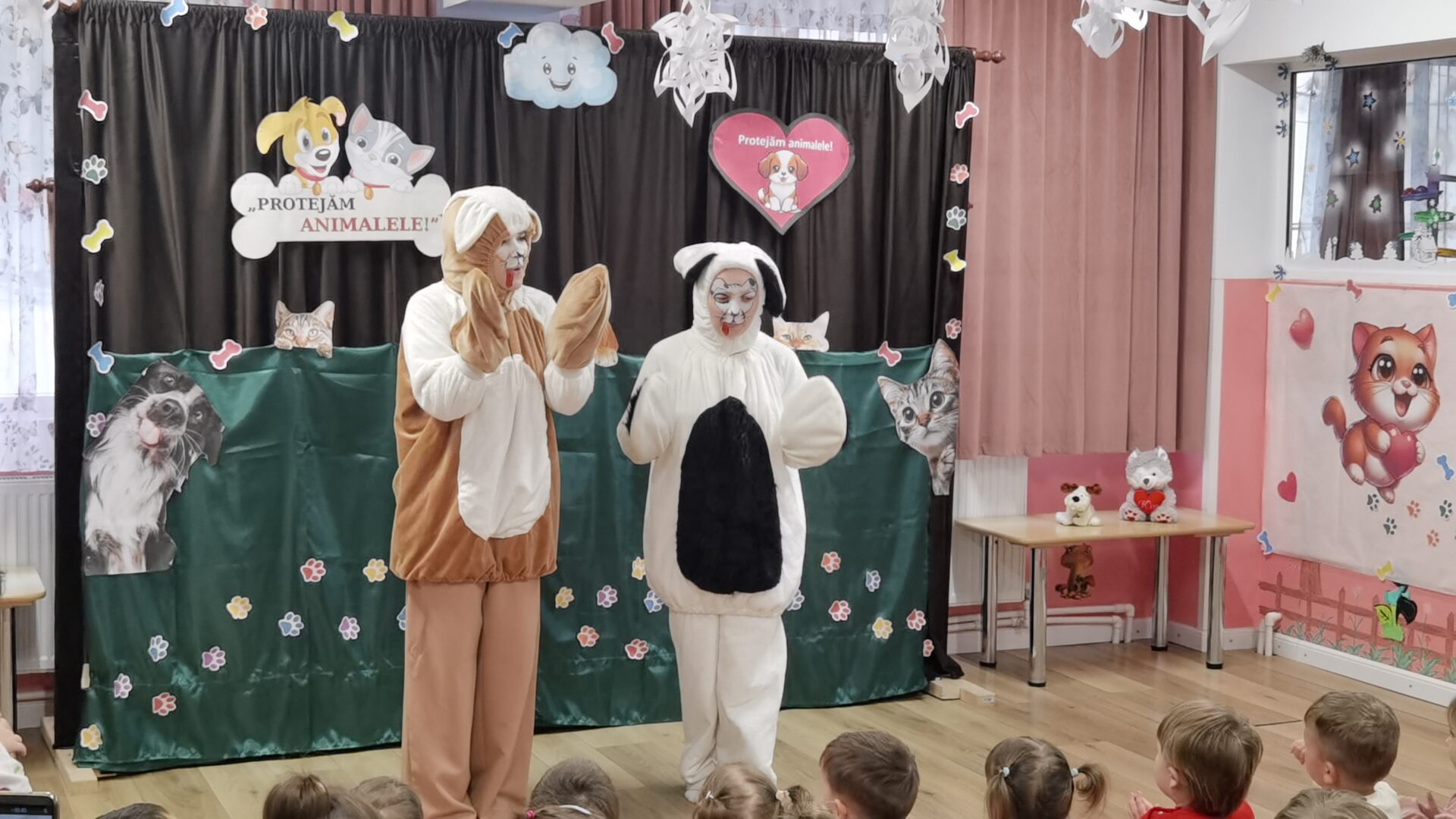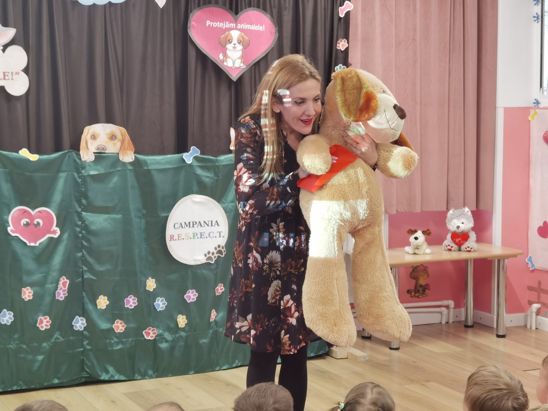 Ea a introdus ”în scenă” invitații surpriză – cățelușa Eva și apoi mascotele – căței, cu o scenetă pentru copii, captând atenția și celor mai mofturoși dintre ei.