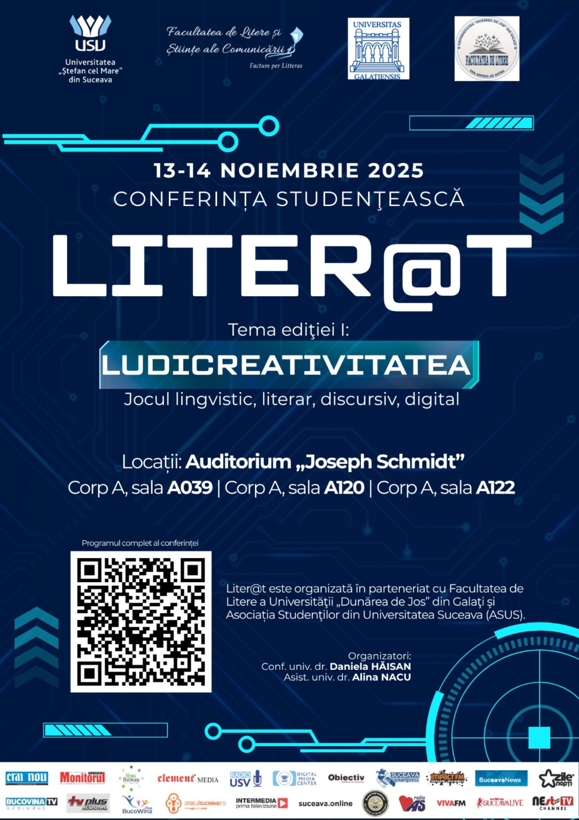 Timp de două zile, pe 13 și 14 noiembrie, Facultatea de Litere și Științe ale Comunicării din cadrul Universității „Ștefan cel Mare” din Suceava (USV), în parteneriat cu Facultatea de Litere a Universităţii „Dunărea de Jos” din Galaţi şi Asociația Studenţilor din Universitatea Suceava (ASUS), organizează prima ediție a conferinței studențești Liter@t. Intitulată LUDICREATIVITATEA (Jocul lingvistic, literar, discursiv, digital), conferința a atras peste o sută de studenți din domeniile Filologie, Comunicare şi relaţii publice, Media digitală și Jurnalism din șase centre universitare (Universitatea „Dunărea de Jos” din Galaţi, Universitatea din Bucureşti, Universitatea „Alexandru Ioan Cuza” din Iaşi, Universitatea „Babeş-Bolyai” din Cluj-Napoca, Universitatea de Medicină, Farmacie, Ştiinţe şi Tehnologie „George Emil Palade” din Târgu Mureş și Universitatea „Ştefan cel Mare” din Suceava), care vor prezenta lucrări în limbile română, engleză, franceză, spaniolă și italiană.