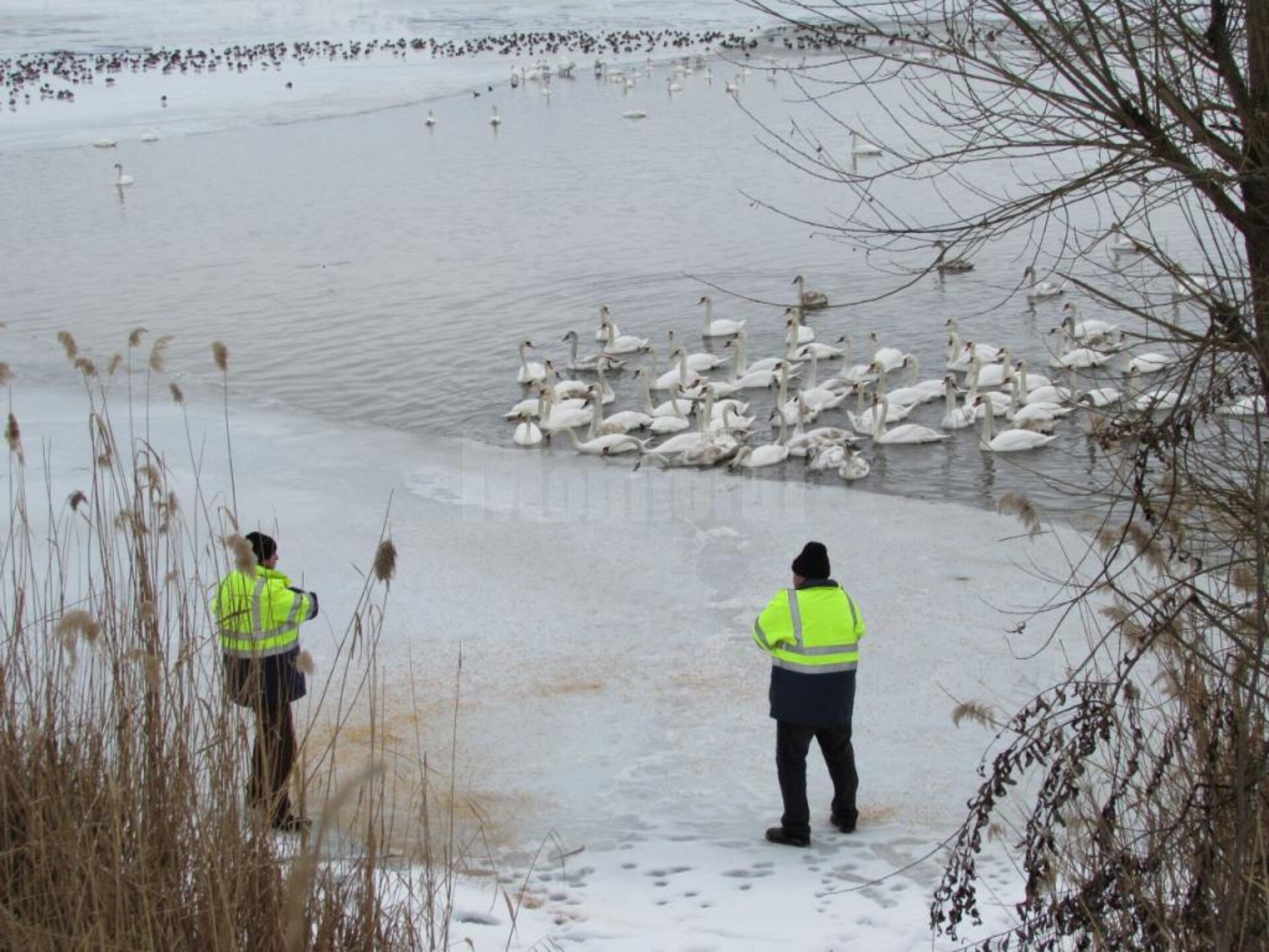 Primăria Fălticeni hrănește lebedele care iernează pe iazurile din municipiu