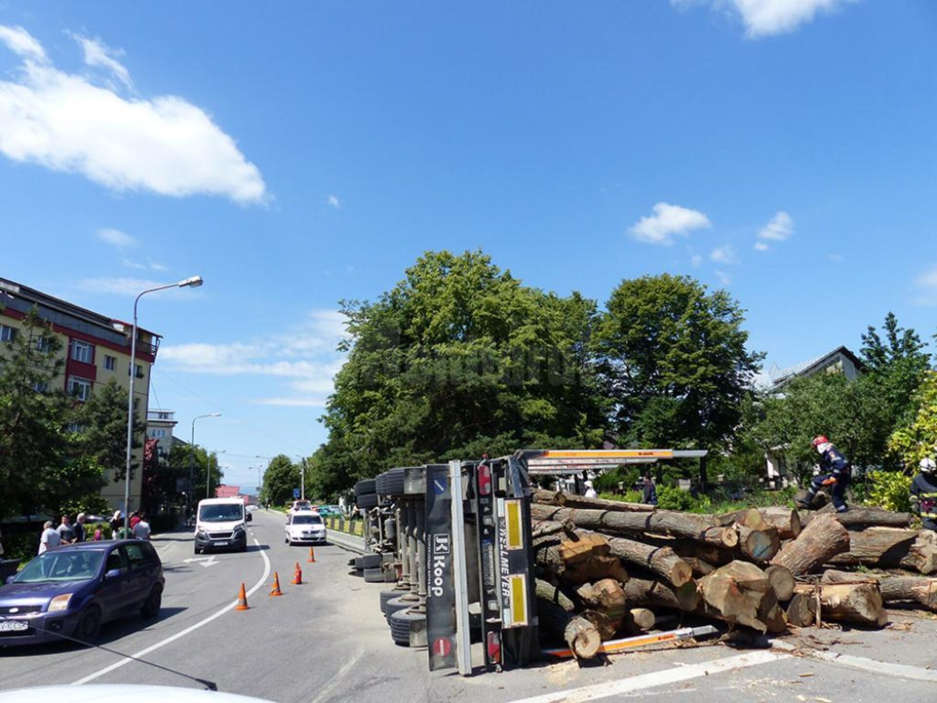 Miercuri, în jurul orei 10.50, un tânăr în vârstă de 32 de ani, aflat la volanul unui autocamion IVECO, cu semiremorcă, care transporta material lemnos, circula pe strada Cuza Vodă 1, dinspre zona Torino. Ajuns în curba strânsă la stânga de la intersecția cu strada Plevnei, în apropiere de punctul de lucru al primăriei din Burdujeni, camionul a fost scăpat de sub control și s-a răsturnat pe partea dreaptă. Încărcătura s-a prăbușit pe carosabil, pe trotuar și în curtea unui localnic, unde a făcut praf gardul. Din fericire, în urma accidentului nu au fost victime.