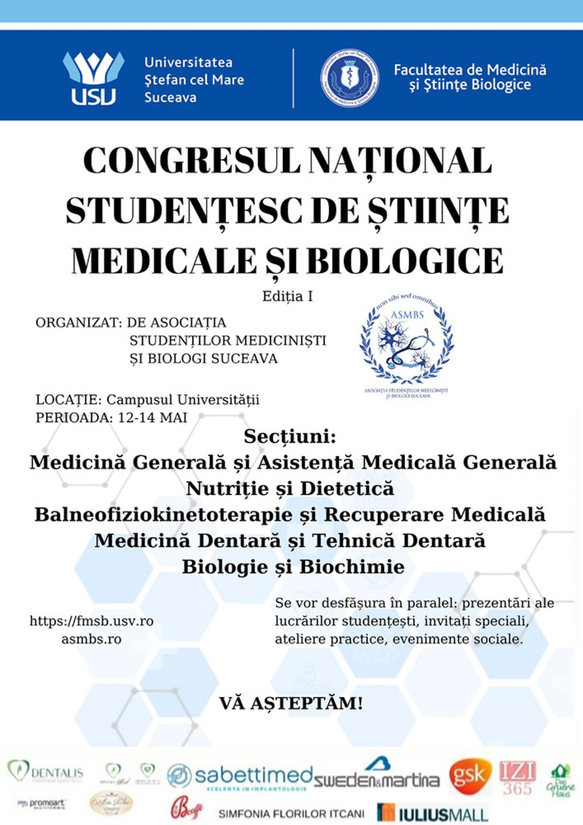 Asociația Studenților Mediciniști și Biologi din cadrul Facultății de Medicină și Științe Biologice a Universității „Ștefan cel Mare” din Suceava (USV) organizează, în perioada 12-14 mai, primul Congres Național Studențesc de Științe Medicale și Biologice, cu titlul „Medicină Integrativă și Științe Biologice”.