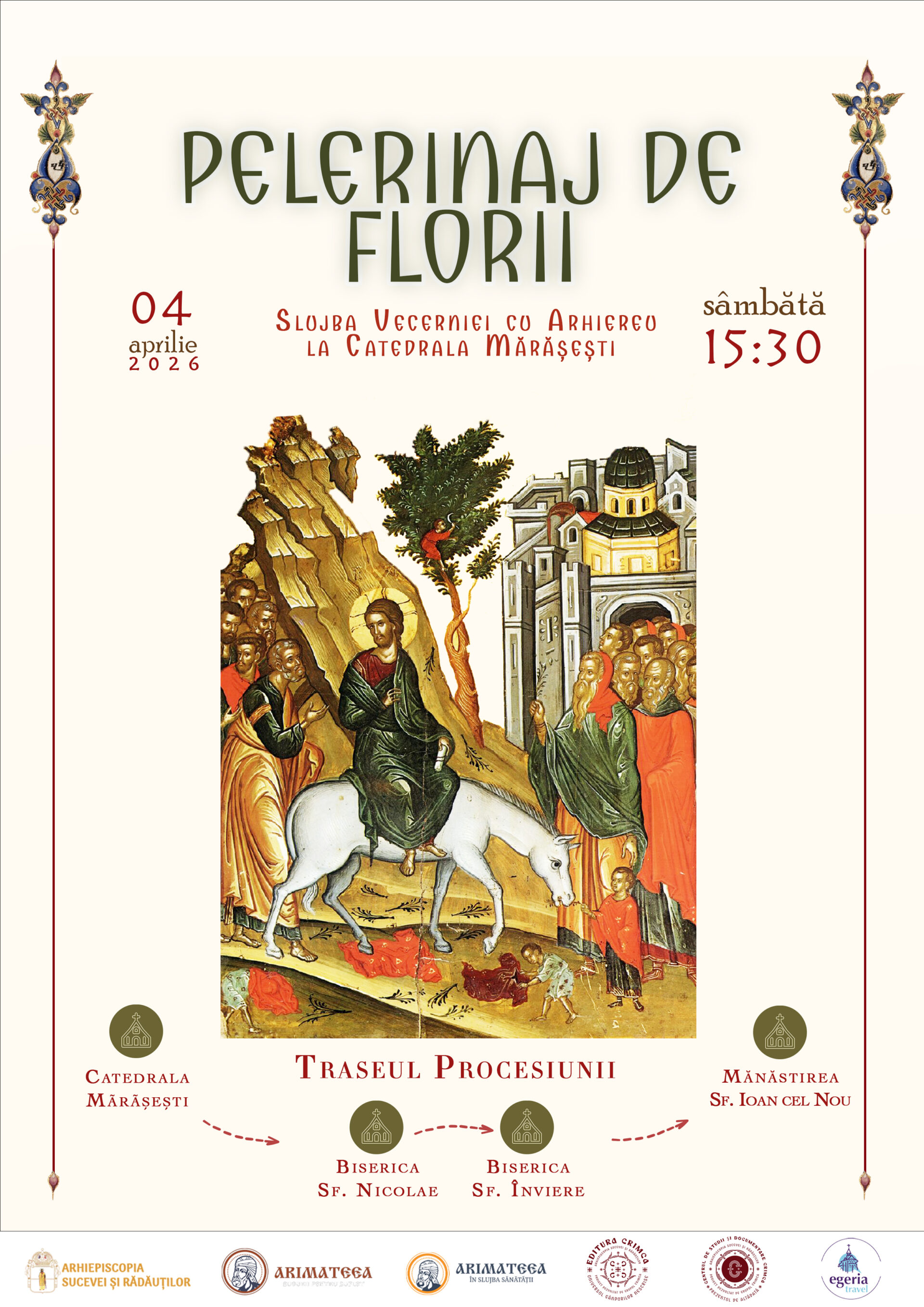 Arhiepiscopia Sucevei și Rădăuților vă invită sâmbătă, 4 aprilie 2026, în ajunul praznicului „Intrării Domnului în Ierusalim”, la Procesiunea de Florii, eveniment la care vor lua parte ierarhii eparhiei, preoți, monahi, monahii, dar și credincioși, între care numeroși copii și tineri.