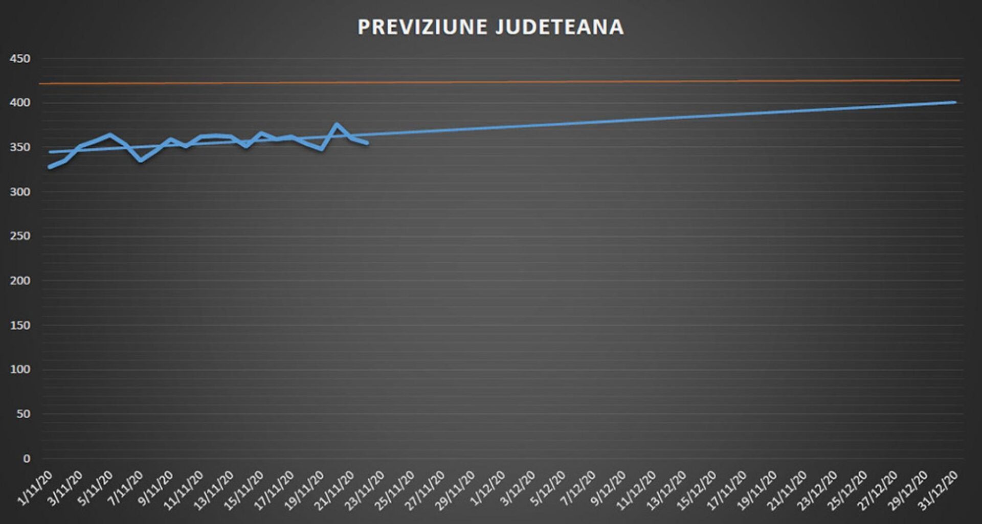 Conducerea Spitalului Județean de Urgență „Sfântul Ioan cel Nou” Suceava a informat Prefectura asupra prognozei asupra evoluției cazurilor de Covid-19 în județ. Astfel, specialiștii din cadrul Spitalului Suceava previzionează o creștere controlată a numărului de cazuri de Covid-19 până la 31 decembrie a.c.. Pe graficul prezentat, linia roșie reprezintă capacitatea maximă pe județ, iar linia albastră reprezintă situația zilnică a cazurilor. Linia albastră continuă este previziunea evoluției. Se vede că intersecția liniilor este după data de 31 decembrie a.c., ceea ce ar reprezenta, spun specialiștii, o evoluție controlată.