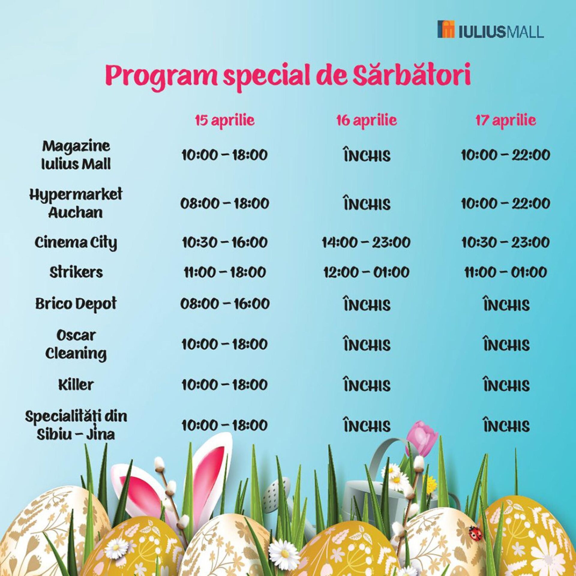 Dacă mai aveți de făcut ultimele cumpărături pentru masa de Paște și trebuie să mergeți să luați câteva cadouri, atunci cu siguranță trebuie să știți că Iulius Mall Suceava este deschis vineri, 14 aprilie, conform programului normal: 10.00 – 22.00, iar sâmbătă, de la ora 10.00 până la 18.00. În Prima zi de Paște, mallul este închis, dar de luni, programul revine la normal. Excepție fac doar Brico Depo, Oscar Cleaning, Specialități din Sibiu Jina și Killer, care vor fi închise și în a doua zi de Paște.