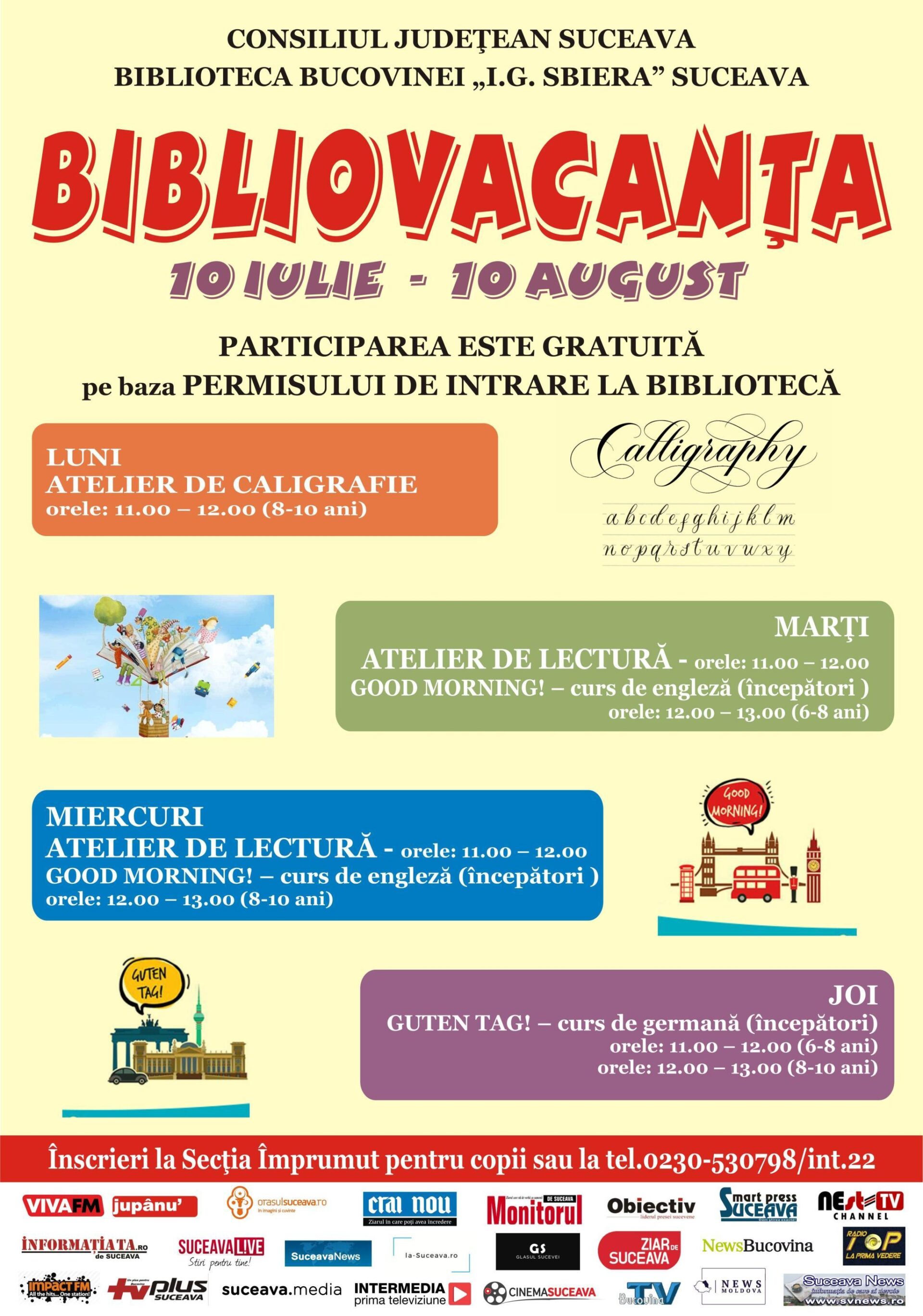 Biblioteca Bucovinei „I.G. Sbiera” Suceava invită copiii cu vârsta cuprinsă între 6 și 10 ani să participe la activitățile gratuite ce se vor desfășura, în perioada 10 iulie – 10 august 2023, în cadrul programului „Bibliovacanța”.