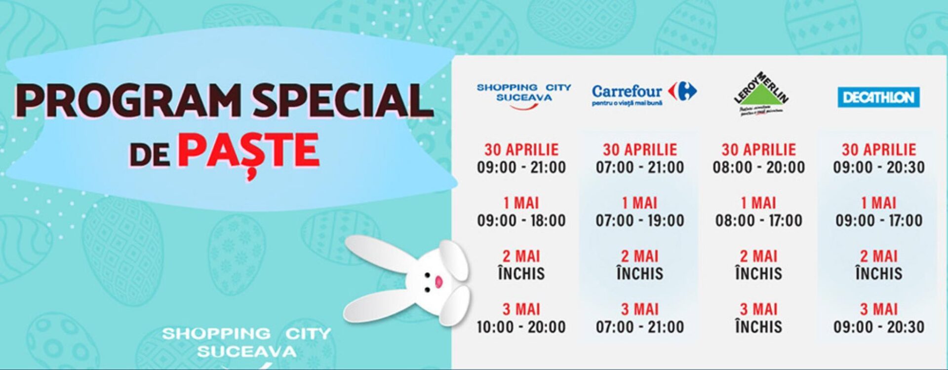 În preajma sărbătorilor de Paști, magazinele centrului comercial Shopping City Suceava vor funcționa după un program special.