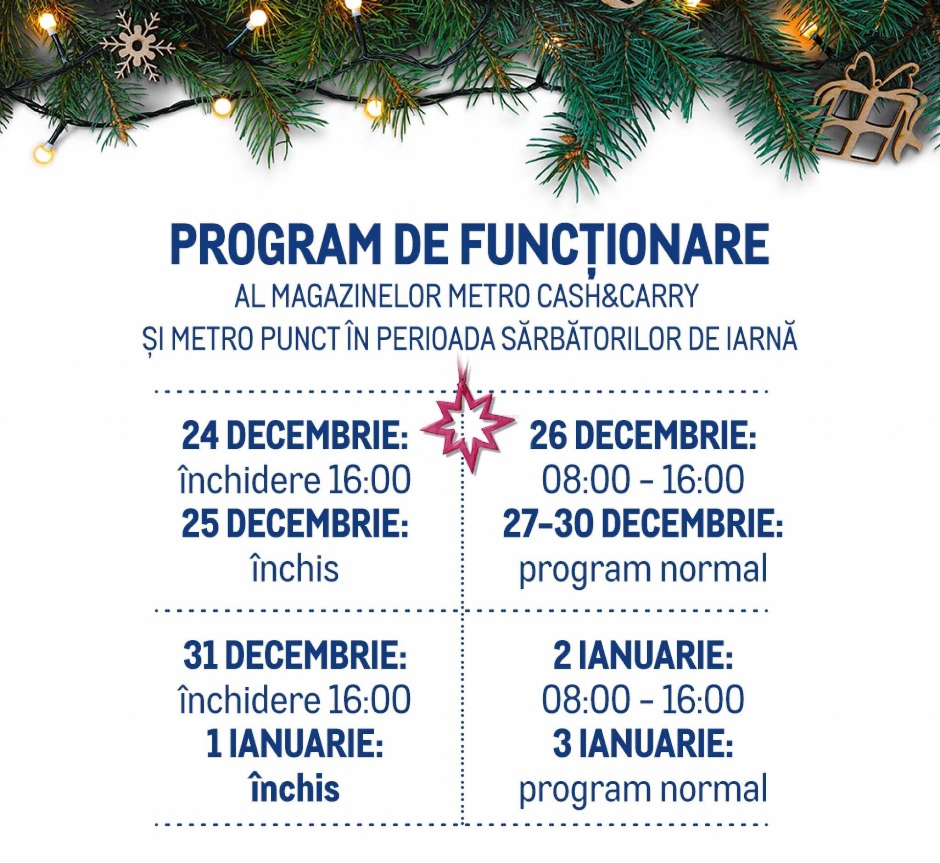 Magazinul Metro va fi deschis pe 24 decembrie până la ora 16.00, iar pe 25 decembrie va fi închis.