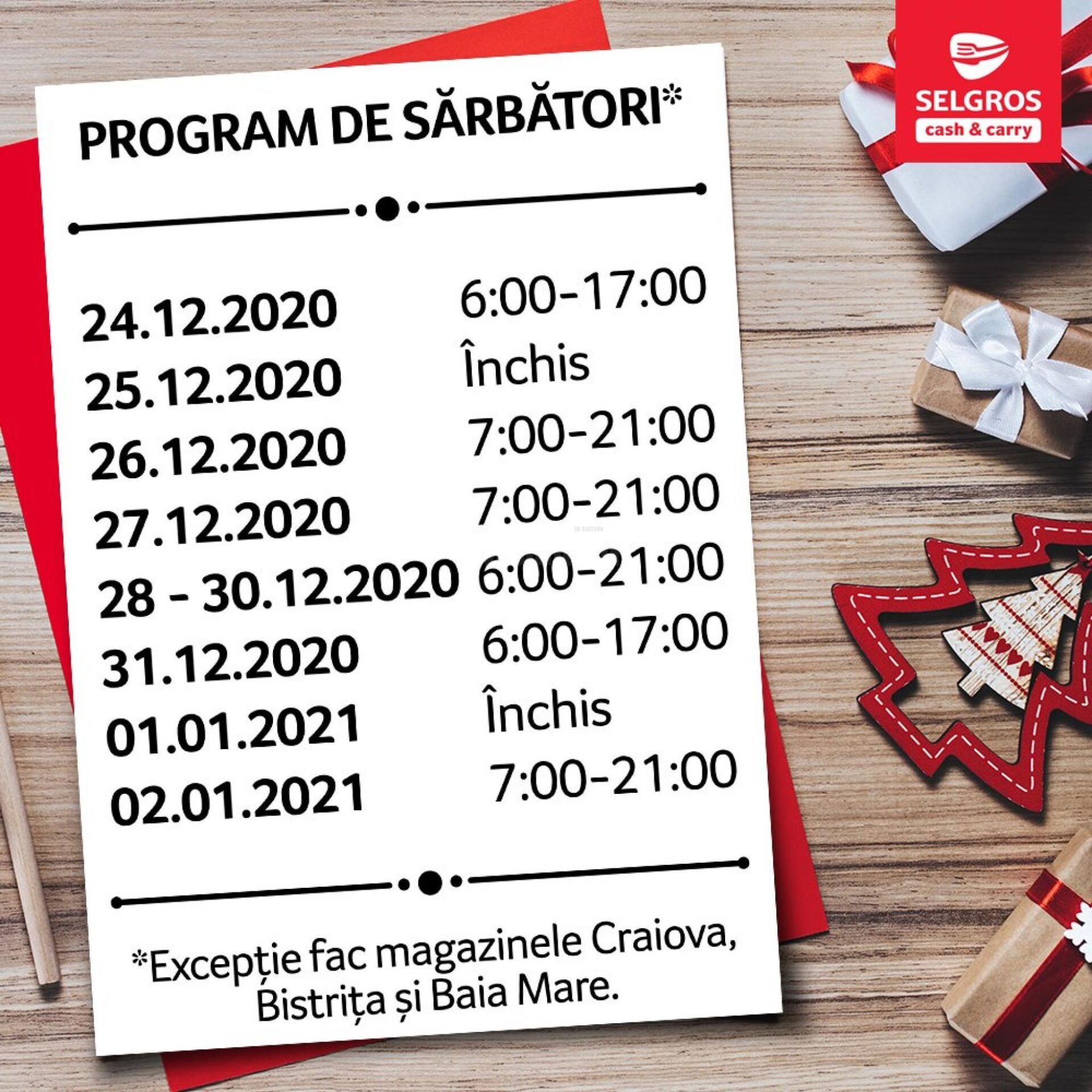 Magazinul Selgros este deschis inclusiv în Ajun, dar cu un program redus: 06.00 – 17.00. Pe 25 decembrie Selgros este închis, dar din 26 decembrie revine la program normal: 07.00 – 21.00.