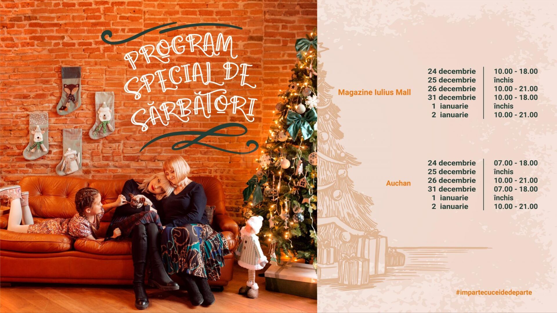 Dacă pe 24 decembrie încă mai faci cumpărături, magazinele sunt deschise între orele 10.00 – 18.00, iar hipermarketul Auchan funcționează în intervalul orar 07.00 – 18.00. În prima zi de Crăciun, pe 25 decembrie, cu toții ne bucurăm de clipe frumoase în familie, iar magazinele din Iulius Mall Suceava și hipermarketul Auchan vor fi închise.