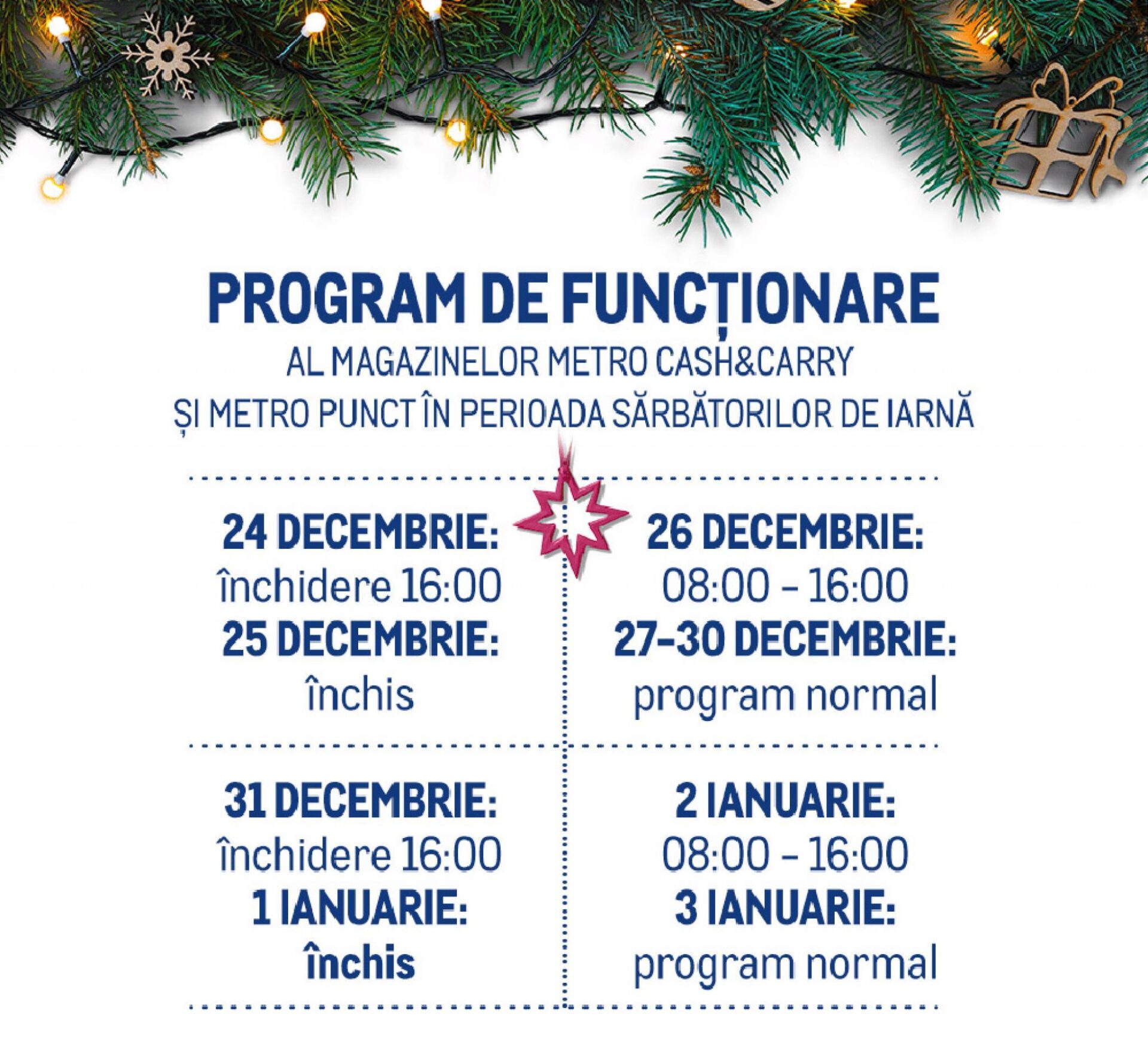 Magazinul Metro va fi deschis pe 24 decembrie până la ora 16.00, iar pe 25 decembrie va fi închis.