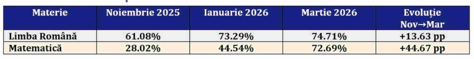 „Rata de promovare la matematică a crescut de la 28% (noiembrie 2025) la 72,7% (martie 2026) – o creștere de +44,7 puncte procentuale. De asemenea, rata de promovare la română a evoluat de la 61,1% la 74,7% (+13,6 pp)”, relevă analiza IȘJ.