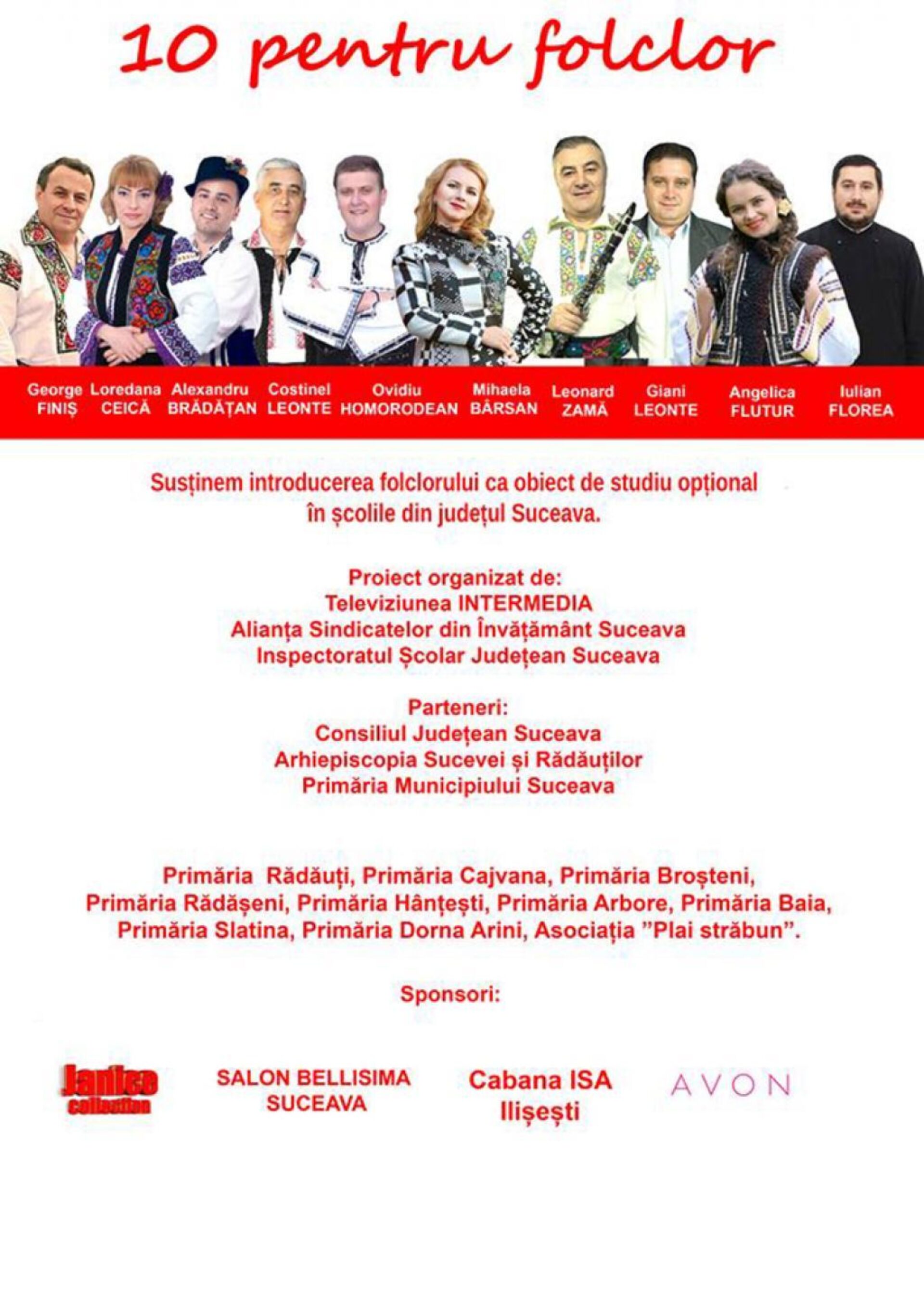 Proiectul ”10 pentru folclor”, ediția a III-a, debutează astăzi, 12 februarie, la ora 10:00, la Colegiul Național „Mihai Eminescu” Suceava, cu deschiderea oficială, eveniment la care vor participa artiști populari consacrați din județ și nu numai. Cei 10 membri ai echipei din acest an sunt interpretul de muzică populară George Finiș, reprezentantul Consiliului Județean Suceava, profesoara Loredana Ceică, reprezentantul Inspectoratului Școlar Județean Suceava, Ovidiu Homorodean, interpret de muzică populară, Costinel Leonte, maestru coregraf, Alexandru Brădățan, interpret de muzică populară, Mihaela Bârsan, realizator de emisiuni de folclor, inițiatoarea proiectului „10 pentru folclor”, poliinstrumentistul Leonard Zamă, profesorul Giani Leonte, președintele Alianței Sindicatelor din Învățământ Suceava, Angelica Flutur, interpret de muzică populară, și Iulian Florea, preotul paroh al Bisericii „Sf. Dumitru” din municipiul Suceava, reprezentantul Arhiepiscopiei Sucevei și Rădăuților.