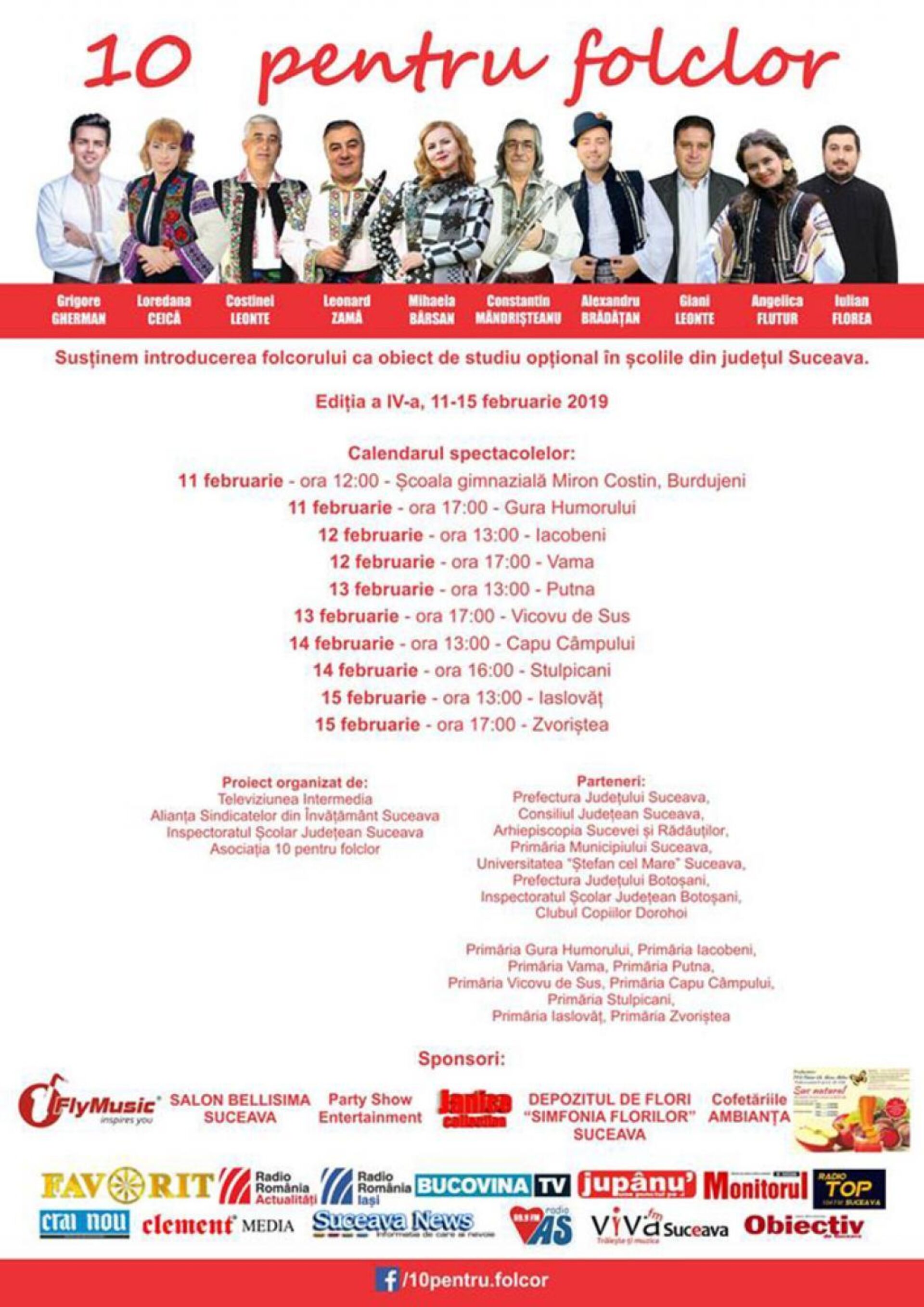 Proiectul „10 pentru folclor”, ediția a IV-a, debutează luni, 11 februarie, la ora 12:00, la Școala Gimnazială „Miron Costin” din municipiul Suceava, când va avea loc și deschiderea oficială a evenimentului. Anul acesta, în proiect sunt implicați toți membrii Ansamblului Artistic Profesionist ”Ciprian Porumbescu” din municipiul Suceava, alături de zeci de artiști din județele Suceava, Botoșani și Maramureș. La deschidere, vor participa cei 10 primari din localitățile care au găzduit caravana folclorului în 2018: Suceava, Rădășeni, Dorna Arini, Broșteni, Cajvana, Rădăuți, Hănțești, Slatina și Baia. Edilii vor preda oficial ștafeta colegilor din Gura Humorului, Vama, Iacobeni, Putna, Vicovu de Sus, Capu Câmpului, Stulpicani, Iaslovăț și Zvoriștea, în prezența prefectului județului Suceava, Mirela Adomnicăi.
