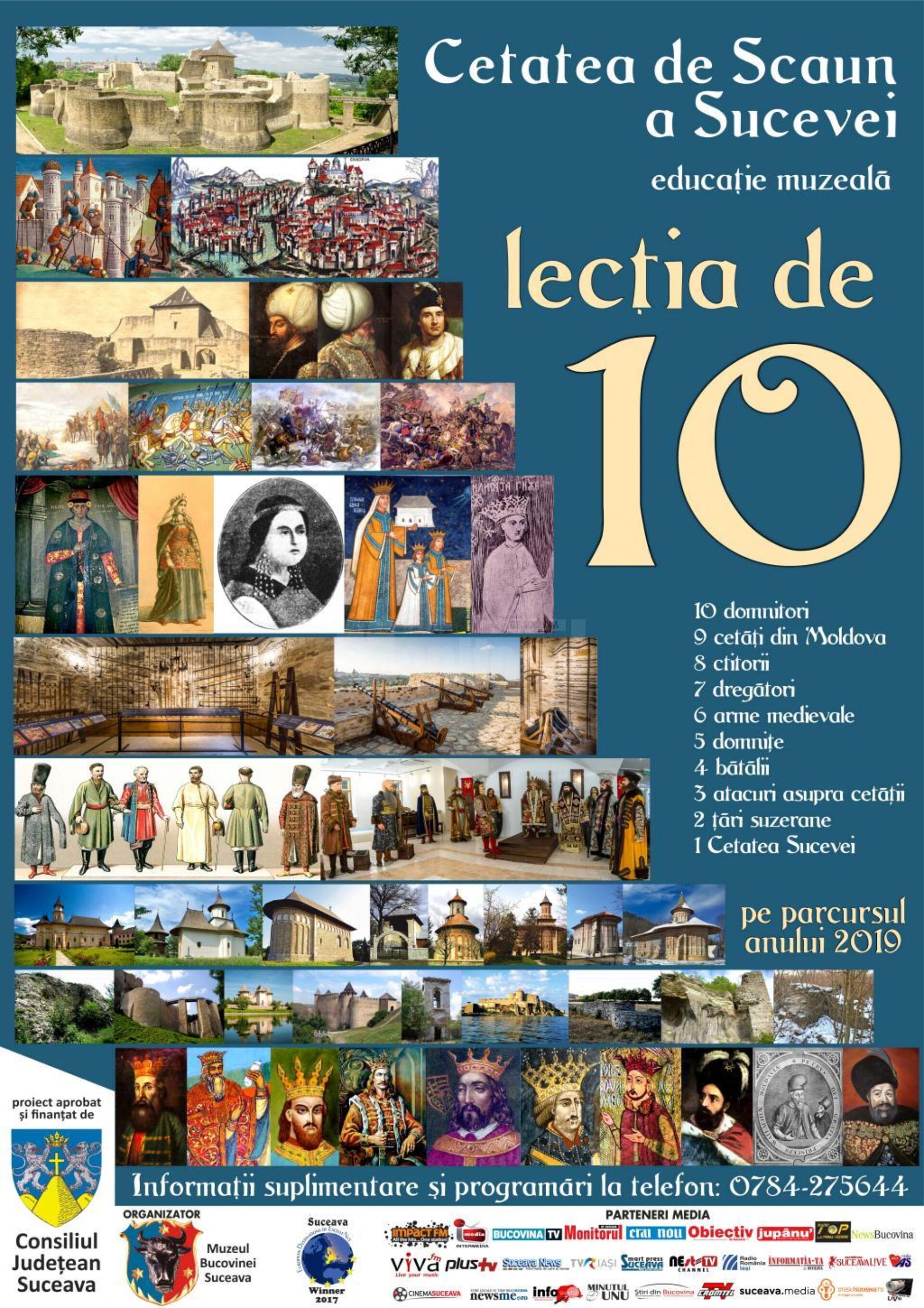 La Cetatea de Scaun a Sucevei (în incinta Casei Custodelui) se desfășoară proiectul educațional „Lecția de 10”. Proiectul este destinat în special elevilor de școală gimnazială, iar organizatorii au ca scop apropierea elevilor de disciplina istorie, încercând să le faciliteze înțelegerea diferitelor contexte istorice sau termeni istorici.„Lecția de 10” este structurată pe 10 capitole din istoria Moldovei, astfel: 10 domnitori, 9 cetăți din Moldova, 8 ctitorii ștefaniene, 7 dregătorii, 6 arme medievale, 5 domnițe, 4 bătălii importante, 3 atacuri asupra Cetății de Scaun, 2 țări suzerane și Cetatea de Scaun. „Se dorește ca prin subiectele discutate în cadrul acestor lecții, să stârnim interesul, curiozitatea precum și dorința elevilor de a afla mai multe despre un anumit capitol din istoria Moldovei. Fiecare lecție este completată de diferite activități interactive, cum ar fi realizarea unei machete de cetate din hârtie cartonată, confecționarea de arme medievale din hârtie, puzzle-uri etc. menite să consolideze cunoștințele acumulate”, au declarat reprezentanții Muzeului Bucovinei. Materialele necesare pentru aceste activități sunt puse la dispoziție de organizatori.”Pentru participarea la acest proiect este nevoie de programare, cadrul didactic care însoțește grupul de elevi putând opta și pentru lecția de istorie pe care o dorește. Puteți obține informații suplimentare sau vă puteți programa la numărul de telefon 0784 275644, persoana de contact muzeograf Paula Moroșanu”, au precizat reprezentanții muzeului.