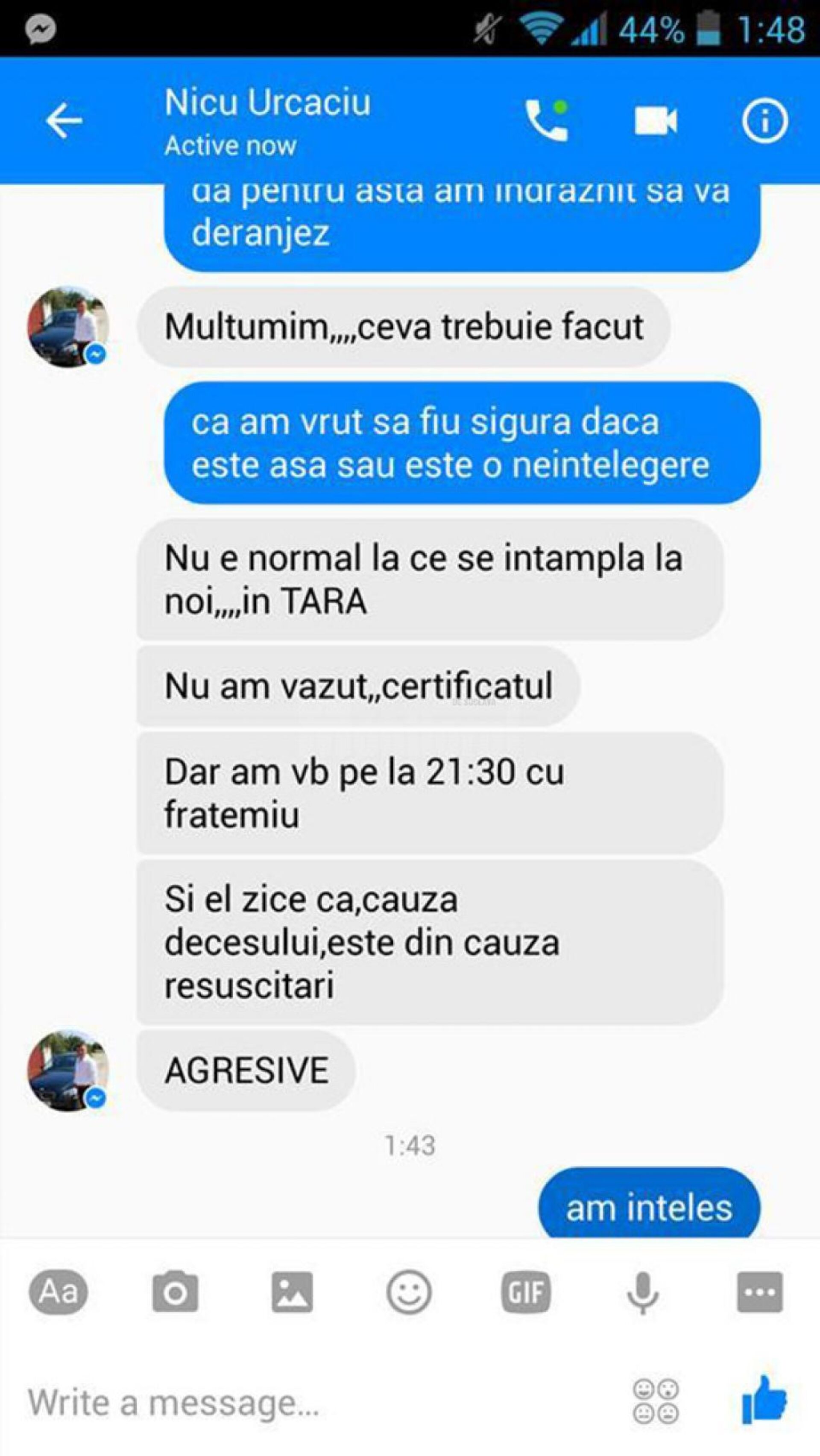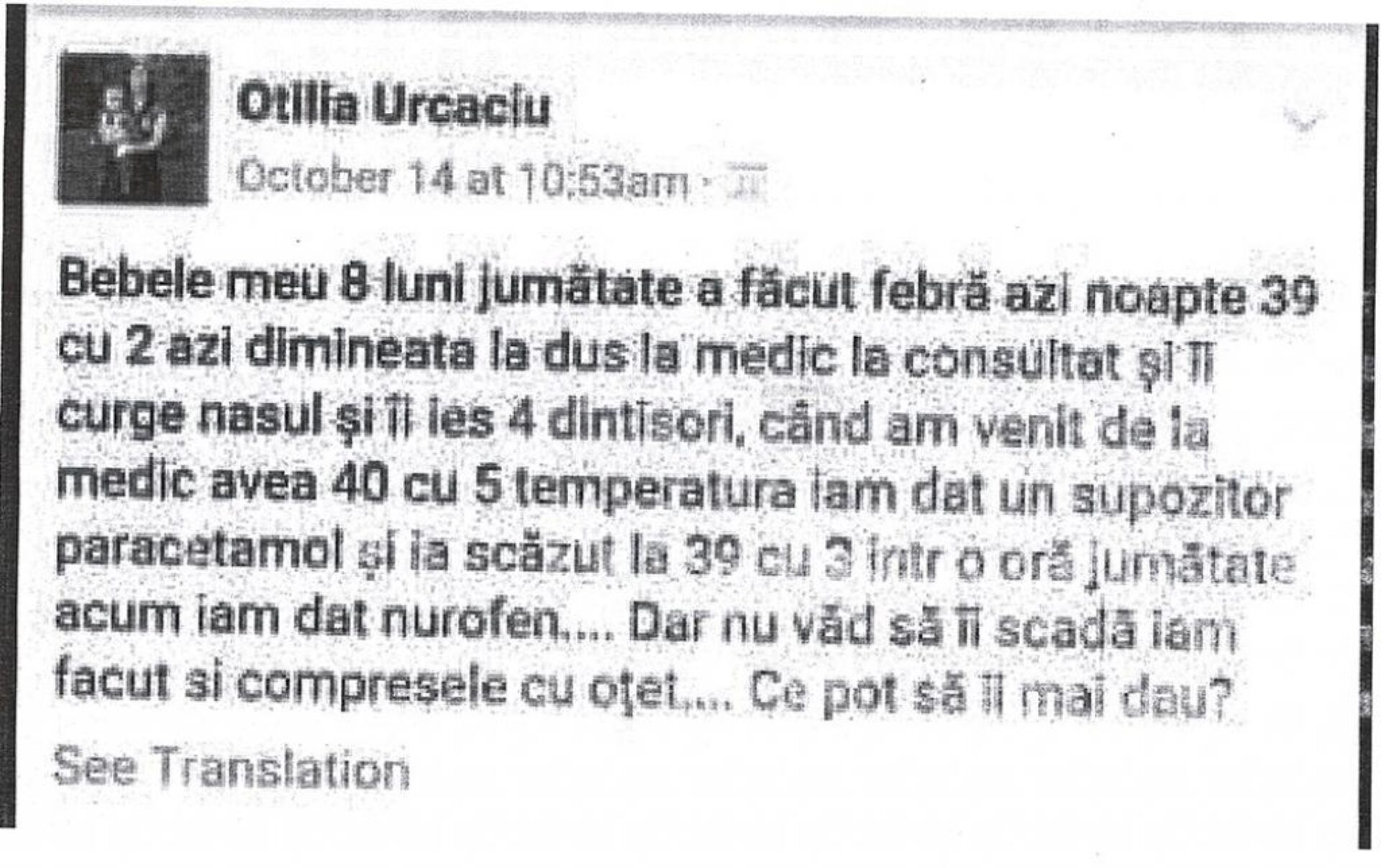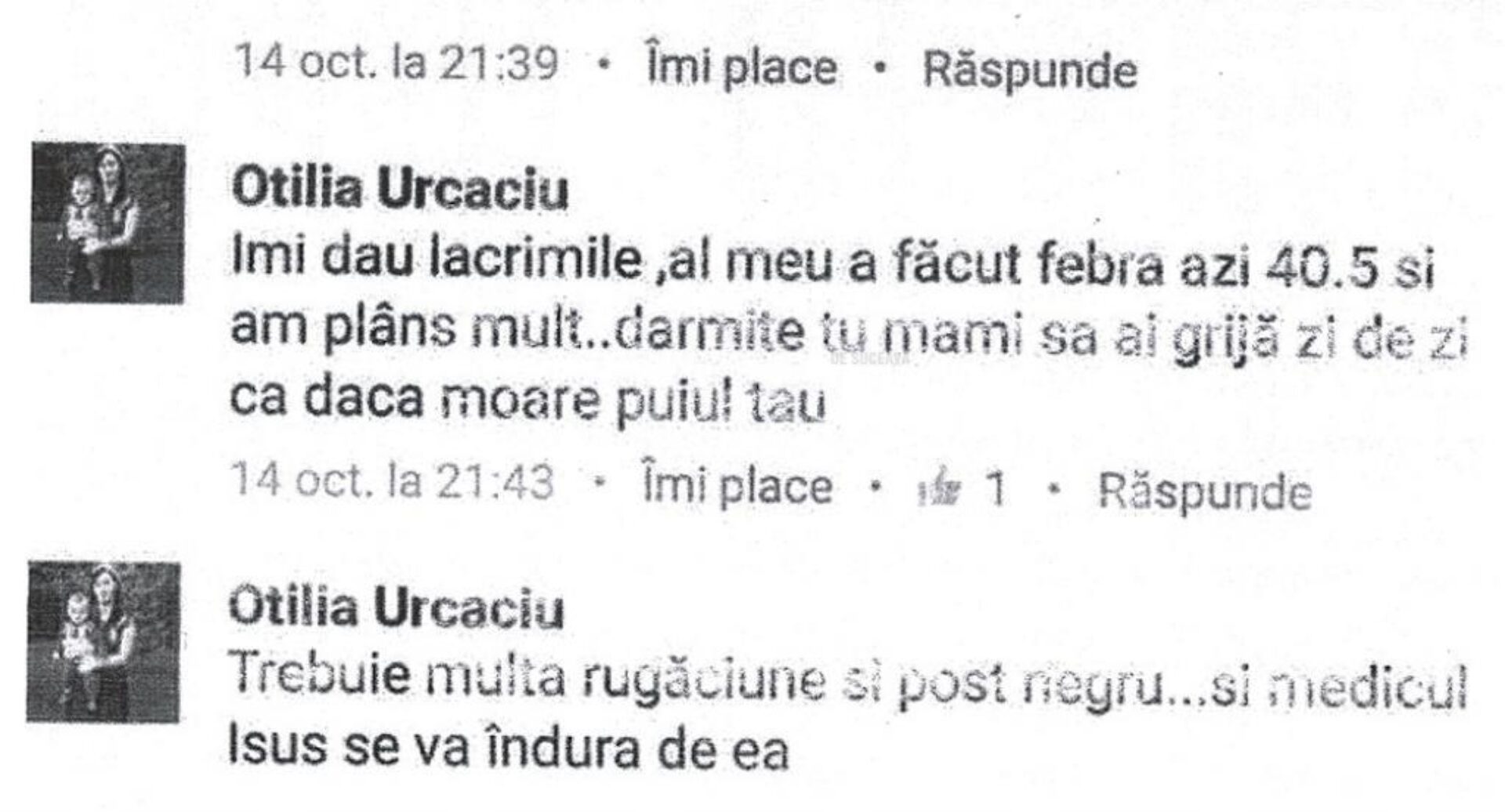 Acesta a mai spus că din investigațiile spitalului efectuate inclusiv pe Facebook a reieșit că sugarul avea probleme de sănătate din data de 8 octombrie a.c., ”când a cerut sprijinul mămicilor de pe site și nu ajutorul specializat al medicilor”. Fotocopiile postărilor de pe Facebook arată că încă din 8 octombrie, mama, Otilia Urcaciu, a întrebat alte mame dacă siropul de soc este bun pentru febră la copii. Într-o postare din 14 octombrie, la ora 10.53, Otilia Urcaciu spune că în noaptea precedentă fiul ei a făcut febră 39,2, că a fost la doctor și după ce a venit acasă febra a urcat la 40,5. Spune că i-a administrat copilului un supozitor cu paracetamol, febra a scăzut în peste o oră la 39,3 și întreabă mamele ce să îi mai dea. În seara aceleiași zile, la 21.39 scrie că Mattias a avut febră 40,5 și recomandă unei alte mame să aibă grijă de ”puiul” ei, iar la 21.43 scrie că ”trebuie multă rugăciune și post negru… și medicul Isus se va îndura de ea”.