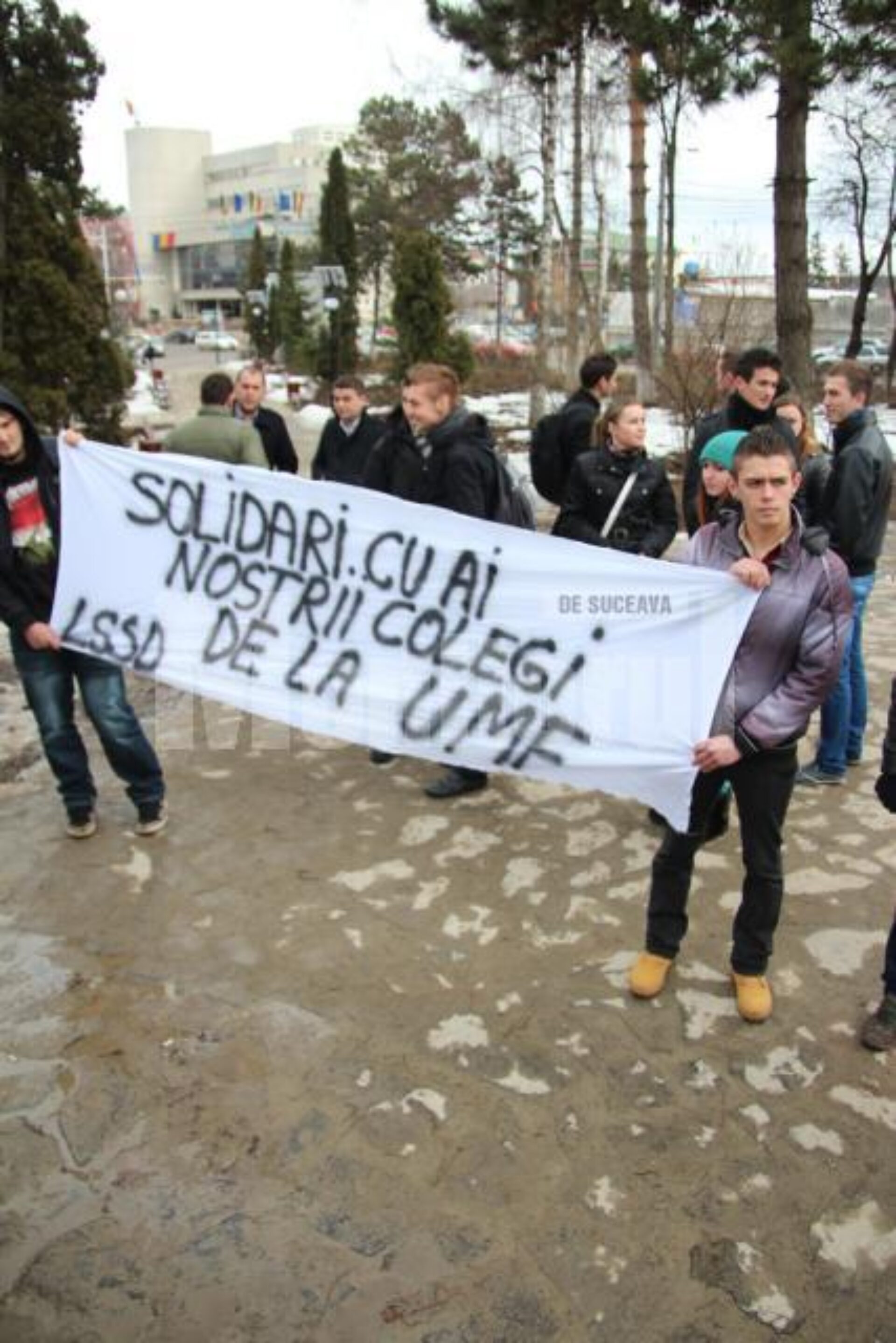 Aproape 30 de studenți membri ai Ligii Studenților Social Democrați din Suceava au protestat în parcul Universității „Ștefan cel Mare” Suceava în semn de solidaritate cu studenții de la Universitatea de Medicină și Farmacie din Târgu-Mureș. Protestul spontan de la Suceava a fost organizat după ce câteva sute de studenți au protestat la Târgu-Mureș, solicitând liderilor politici ca UMF să nu fie folosită ca obiect de troc politic. La Suceava, studenții social-democrați au venit în parcul universității cu două pancarte, mesajul scris pe una dintre acestea având greșeli gramaticale. Astfel, dacă pe o pancartă se putea citi „PDL+UDM = trădători de țară”, iar pe cealaltă, studenții au scris „Solidari cu ai noștrii colegi de la UMF”.