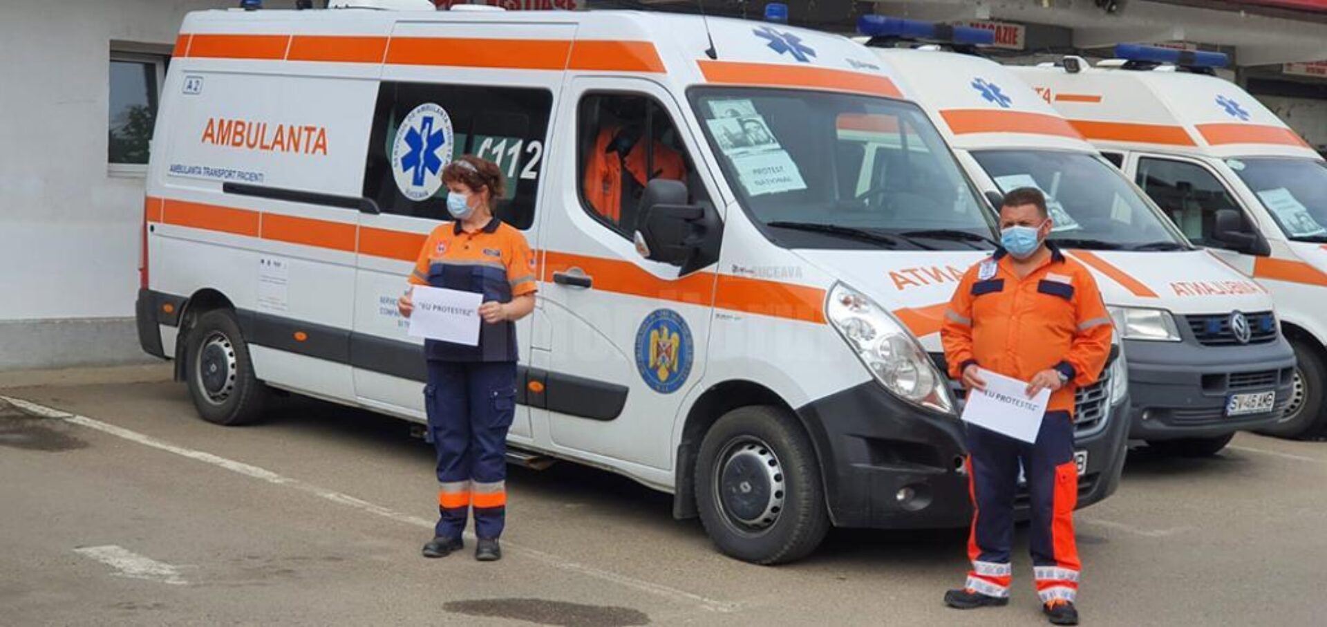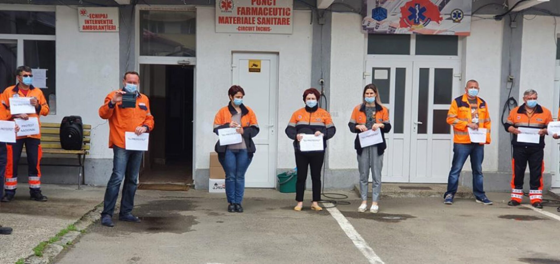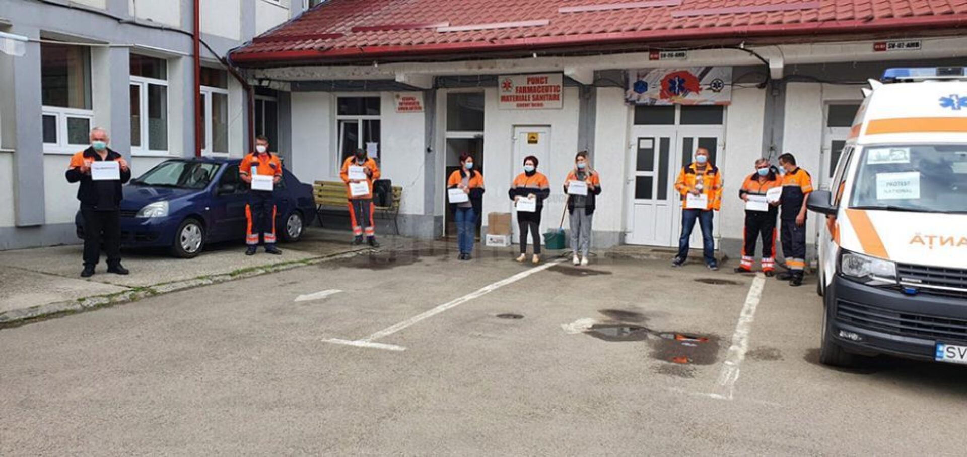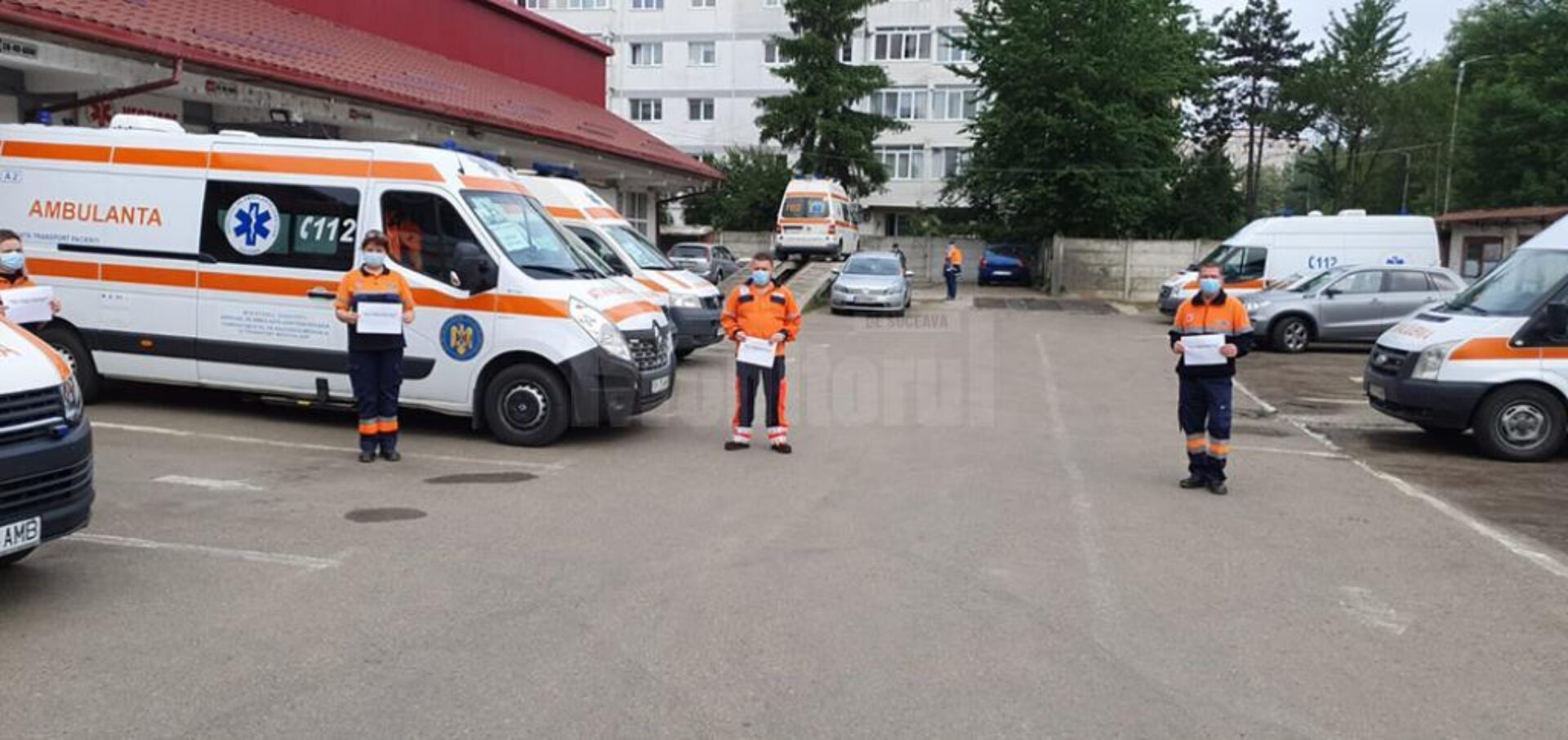 Pe parbrizele autospecialelor de intervenție au fost postate atât afișe pe care scria „Protest național”, cât și fotografiile celor doi ambulanțieri de la SAJ Suceava, Cristian Stupiuc, în vârstă de 52 de ani, și Ioan Irimescu, în vârstă de 61 de ani, care și-au pierdut viața în urma infectării cu Covid-19.