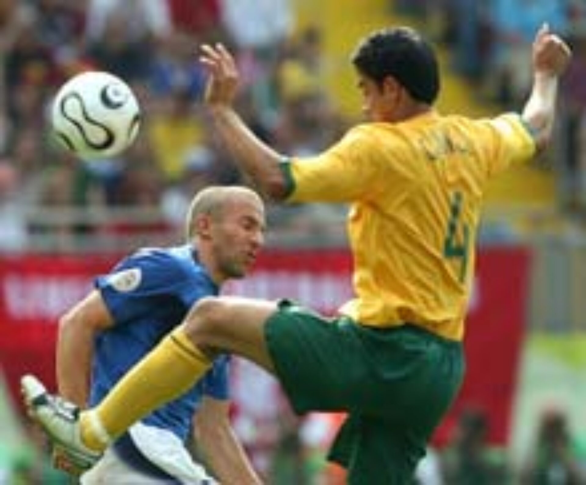 Italia s-a calificat pe ultima sută de metri în sferturile de finală ale Cupei Mondiale, după o evoluție la fel de modestă ca și în meciul din grupă cu SUA. Fundașul Fabio Grosso și atacantul Francesco Totti sunt noii eroi ai Italiei. Deși mulți se așteptau la un scor fluviu, antrenorul Marcello Lippi nu a schimbat tactica nici măcar împotriva Australiei: același joc prudent al Italiei, care a cedat deliberat inițiativa, urmat de contraatacuri tăioase. Statistic, primele 10 minute au fost dominate de australieni, care au avut o posesie de 80 la sută din timpul de joc. Au fost doar cifre reci, căci pe arena Fritz Walter șefii au fost tot elevii lui Marcelo Lippi. „Asaltul” australienilor a constat, de fapt, în câteva centrări care au traversat careul, fără a ridica vreo problemă lui Buffon. Italia a început să își arate colții la ocazia din minutul 20, atunci când șutul foarte periculos al lui Gilardino a fost respins în corner de Schwarzer. Peste numai două minute, Luca Toni i-a pus din nou la încercare vigilența portarului de la Middlesbrough. Replica Australiei nu a întârziat să apară. În minutul 30, Chipperfield a profitat de o bâlbâială în lanț a defensivei europenilor și a șutat din interiorul careului spre buturile lui Buffon, dar tabela a rămas neschimbată. Cu cinci minute înainte de pauză, Gilardino a ratat cea mai mare ocazie a meciului: Del Piero a centrat perfect, dar atacantul lui Milan a reluat incredibil peste poartă din careul de 6 metri. Chiar în debutul celui de-al doilea mitan, Luca Toni a intrat în suprafața de pedeapsă, dar defensiva australiană nu i-a oferit nicio șansă de a expedia balonul spre plasa lui Schwarzer. Discret până atunci, „centralul” Medina Cantalejo a ținut să continue seria spectacolelor jenante oferite de arbitrii la această ediție a Cupei Mondiale. În minutul 50, Bresciano a fost faultat la marginea careului de Materazzi și australienii au cerut acordarea unui cartonaș galben pentru fundașul Italian. Făcând exces de zel, Medina Cantalejo l-a eliminat inexplicabil pe Materazzi. Lippi a reacționat imediat și l-a scos pe Luca Toni, înlocuindu-l cu un fundaș: Barzagli. Rămasă în 10 jucători, dar și fără Del Piero și Luca Toni, Italia a nu a mai contat foarte mult în atac, limitându-se la a stăvili elanul ofensiv al australienilor. De partea cealaltă, „cangurii” au căutat în zadar o breșă în defensiva macaronarilor, iar când aceasta a apărut Buffon a rispit emoțiile. În minutul 82 al partidei, Guus Hiddink a făcut prima schimbare, așteptând prelungirile pentru a împrospăta echipa. A așteptat degeaba. În ultimele secunde ale partiei, Grosso a pătruns în careul australian și s-a împiedicat de Neill, iar Cantalejo a arătat punctual cu var, luând o nouă decizie discutabilă. Înlocuitorul lui Del Piero, Francesco Totti l-a executat cu sânge rece pe Schwarzer. Australia e la pământ, Italia în sferturi, fază a competiției în care va întâlni învingătoarea dintre Elveția și Ucraina.