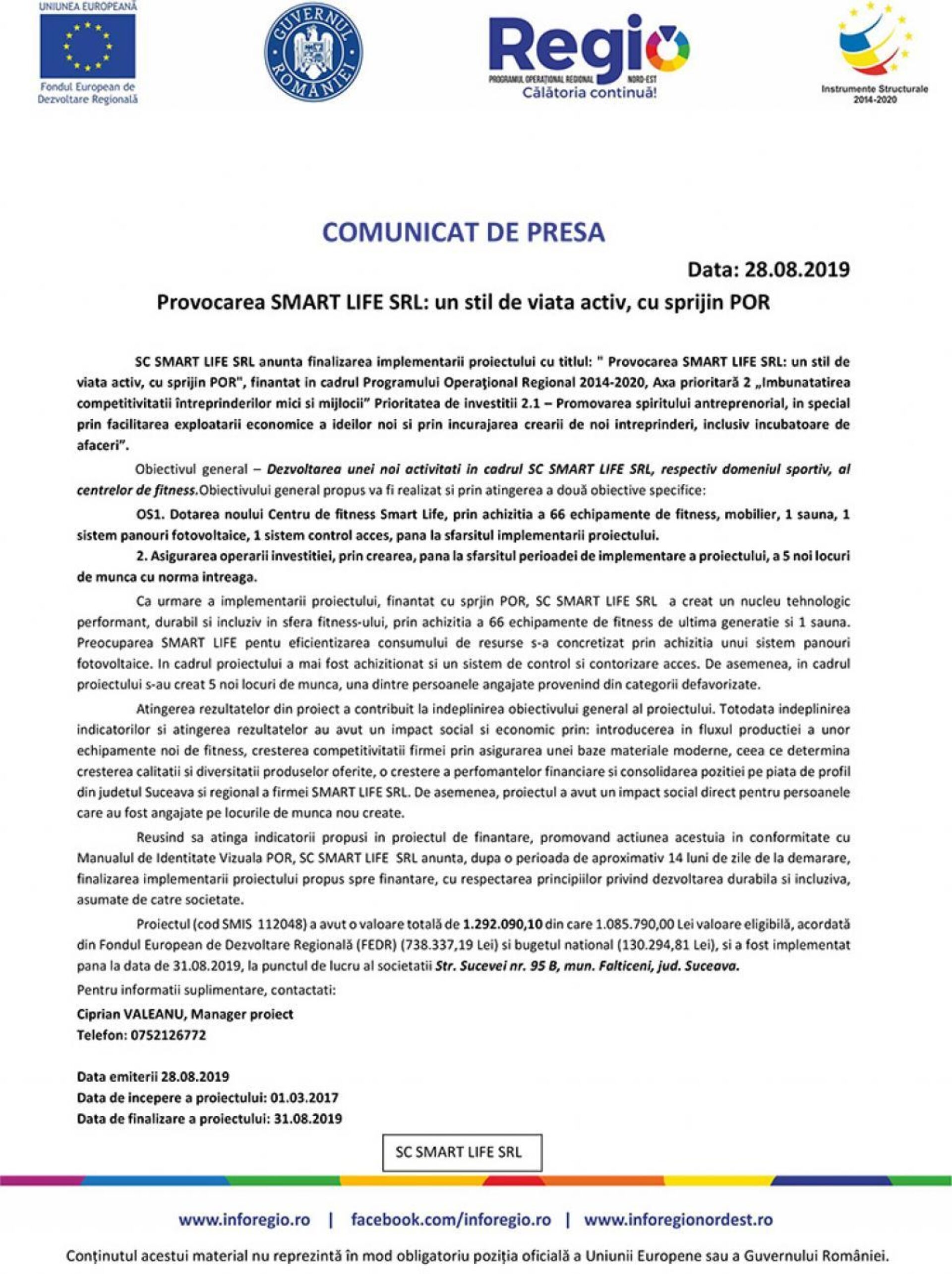 Reusind sa atinga indicatorii propusi in proiectul de finantare, promovand actiunea acestuia in conformitate cu Manualul de Identitate Vizuala POR, SC SMART LIFE SRL anunta, dupa o perioada de aproximativ 14 luni de zile de la demarare, finalizarea implementarii proiectului propus spre finantare, cu respectarea principiilor privind dezvoltarea durabila si incluziva, asumate de catre societate.