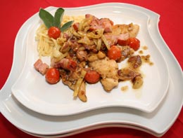 Baconul se taie cuburi după care se prăjește timp de 5 minute. Se scoate pe o farfurie și se pune în uleiul rămas pieptul de pui ce a fost trecut în prealabil prin făină. După ce pieptul s.a rumenit, se scoate alături de bacon. În uleiul rămas, se pun legumele tocate și se adaugă puțin vin alb. Se ține pe foc timp de 20 de minute, după care se adaugă baconul și puiul. Se servește alături de pastele fierte.