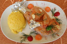Se servește fierbinte, stropit cu mujdei de usturoi, cu mămăliguță sau cu cartofi prăjiți și salată verde.