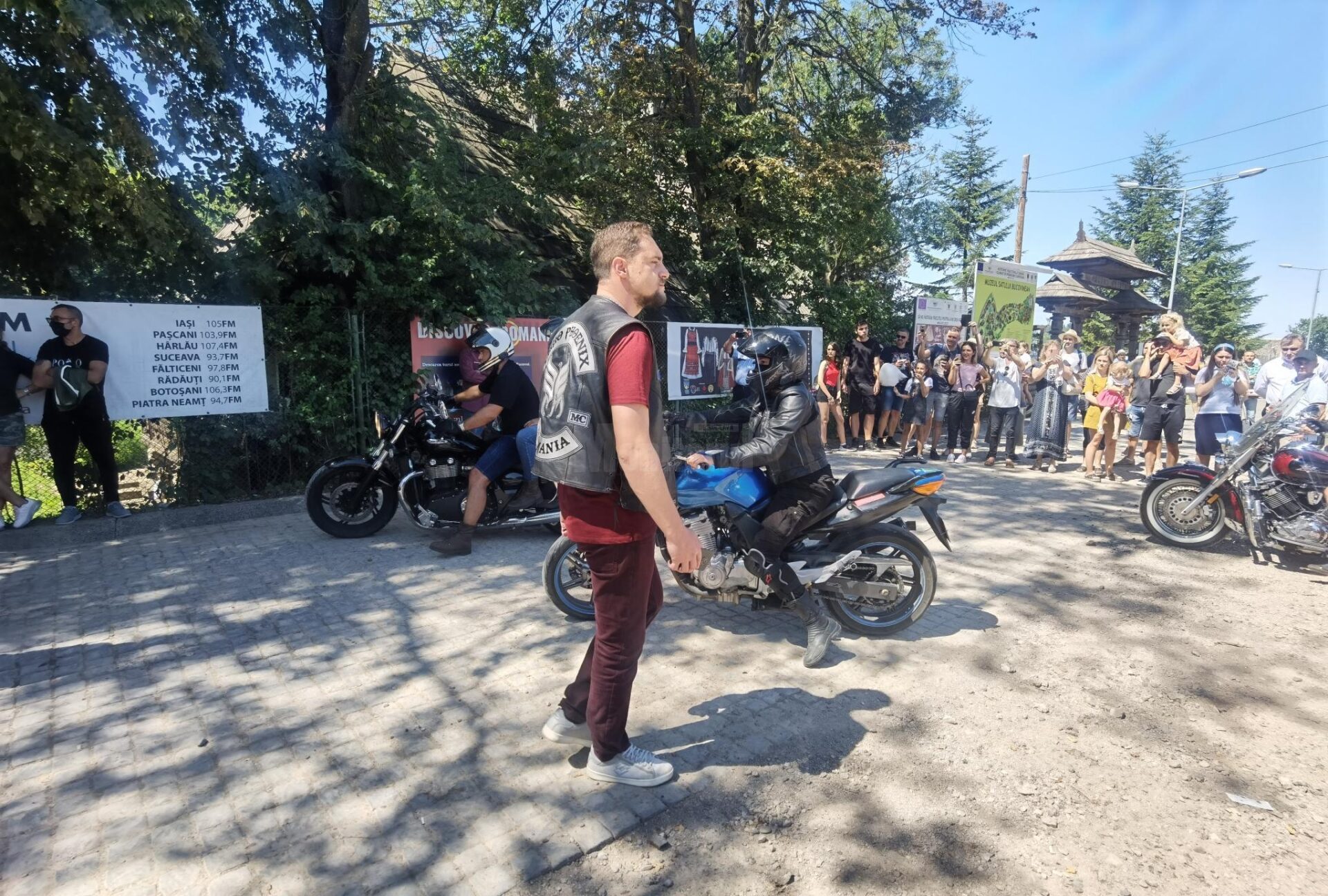 Pe lângă motoarele lor, care au fost admirate de mii de oameni care au venit sus, la Cetate și la Muzeul Satului, dar mai ales de cei sosiți la spectacolele din cadrul festivalului, personajele care urcau pe ele se dovedeau cel puțin la fel de interesante. Tocmai de aceea, la parada moto, aproape toată lumea era cu telefoanele în aer, cu ochii pe participanți, care s-au încolonat, formând un lung “șarpe” negru, cu un capăt în parcarea de lângă Terasa Admiral și altul pe strada care face legătura cu strada principală dintre Suceava și Ipotești.