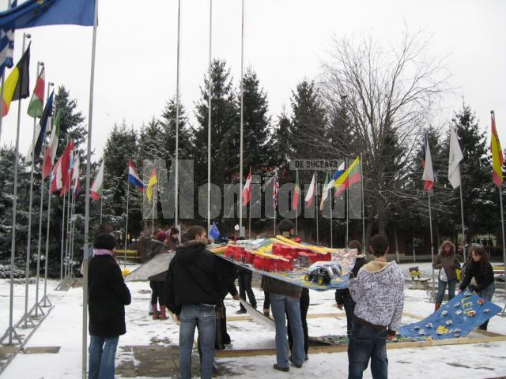 În cadrul proiectului „European Young People sharing their cultures -Tree Dressing Across Europe” și trainingul internațional „Young European Film Makers – Creating A European Image”, organizat, la Suceava, de Asociația Regională de Educare a Adulților Suceava (AREAS), ieri, în piața cu steaguri de lângă Prefectura Suceava, a avut loc o manifestare publică unde au fost prezentate sub forma unui puzzle ideile creative ale mai multor tineri europeni antrenați în proiect.
