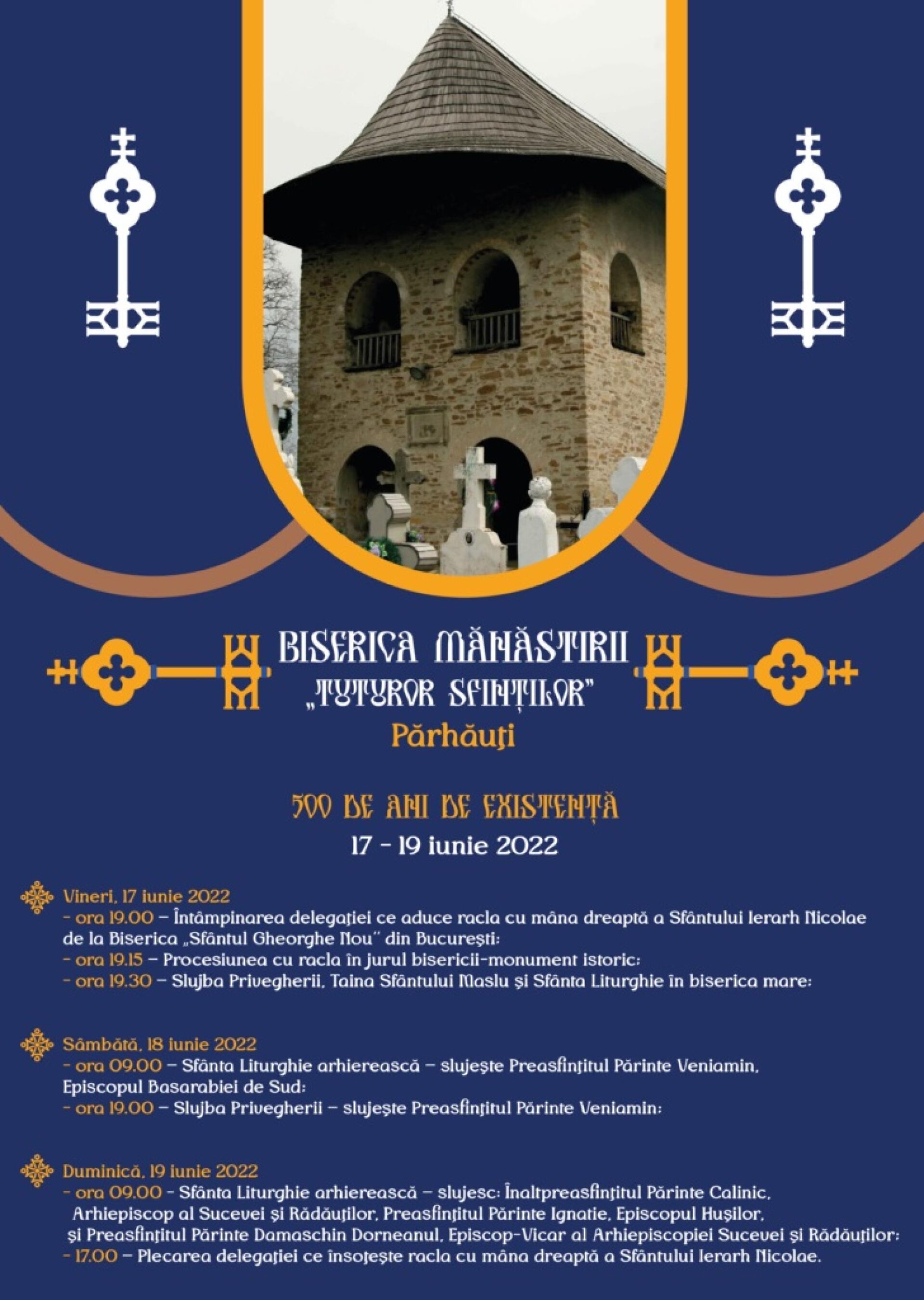 Mâna Sfântului Ierarh Nicolae va poposi, pentru câteva zile, laMănăstirea „Duminica Tuturor Sfinților” din Părhăuți. Conform datelor furnizate de reprezentanții Arhiepiscopiei Sucevei și Rădăuților, credincioșii sunt așteptați, în perioada 17-19 iunie 2022, la Mănăstirea „Duminica Tuturor Sfinților” din Părhăuți, pentru a se închina la Sfintele Moaște ale Sfântului Ierarh Nicolae, Arhiepiscopul Mirei Lichiei, ce vor fi aduse de la Biserica „Sfântul Gheorghe” – Nou din București.„La împlinirea a 500 de ani de la sfințirea Bisericii Mănăstirii „Duminica Tuturor Sfinților” Părhăuți, cu binecuvântarea Preafericitului Părinte Patriarh Daniel și cu purtarea de grijă a Înaltpreasfințitului Părinte Calinic, Arhiepiscop al Sucevei și Rădăuților, racla ce adăpostește mâna Sfântului Ierarh Nicolae va poposi, pentru câteva zile, în localitatea din apropierea municipiului Suceava. Aduse de la Bari în anul 1600, cu binecuvântarea mitropolitului Eftimie al Țării Românești, de însuși voievodul Mihai Viteazul, sfintele moaște au fost dăruite Bisericii „Sfântul Gheorghe” – Nou din București, ultima ctitorie a Sfântului Voievod Martir Constantin Brâncoveanu”, am aflat de la pr. Ștefan Mihalcea.