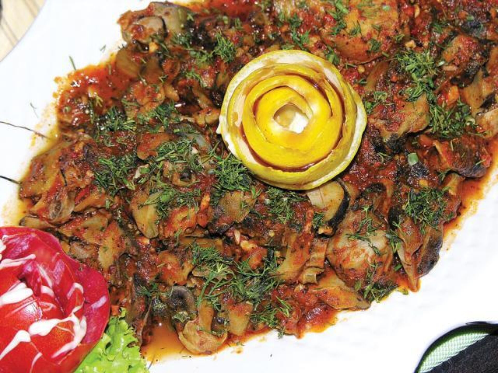 Curățați, spălați și tăiați melcii în bucățele. Înăbușiți-i 10 minute în ulei, apoi stingeți-i cu vinul. După ce vinul se evaporă, puneți sosul de roșii, verdeața tocată mărunt și potriviți de sare și piper. Lăsați să fiarbă la foc mic până când sosul scade, iar la final puneți usturoiul tocat mărunt. Mai lăsați să fiarbă 1-2 minute.