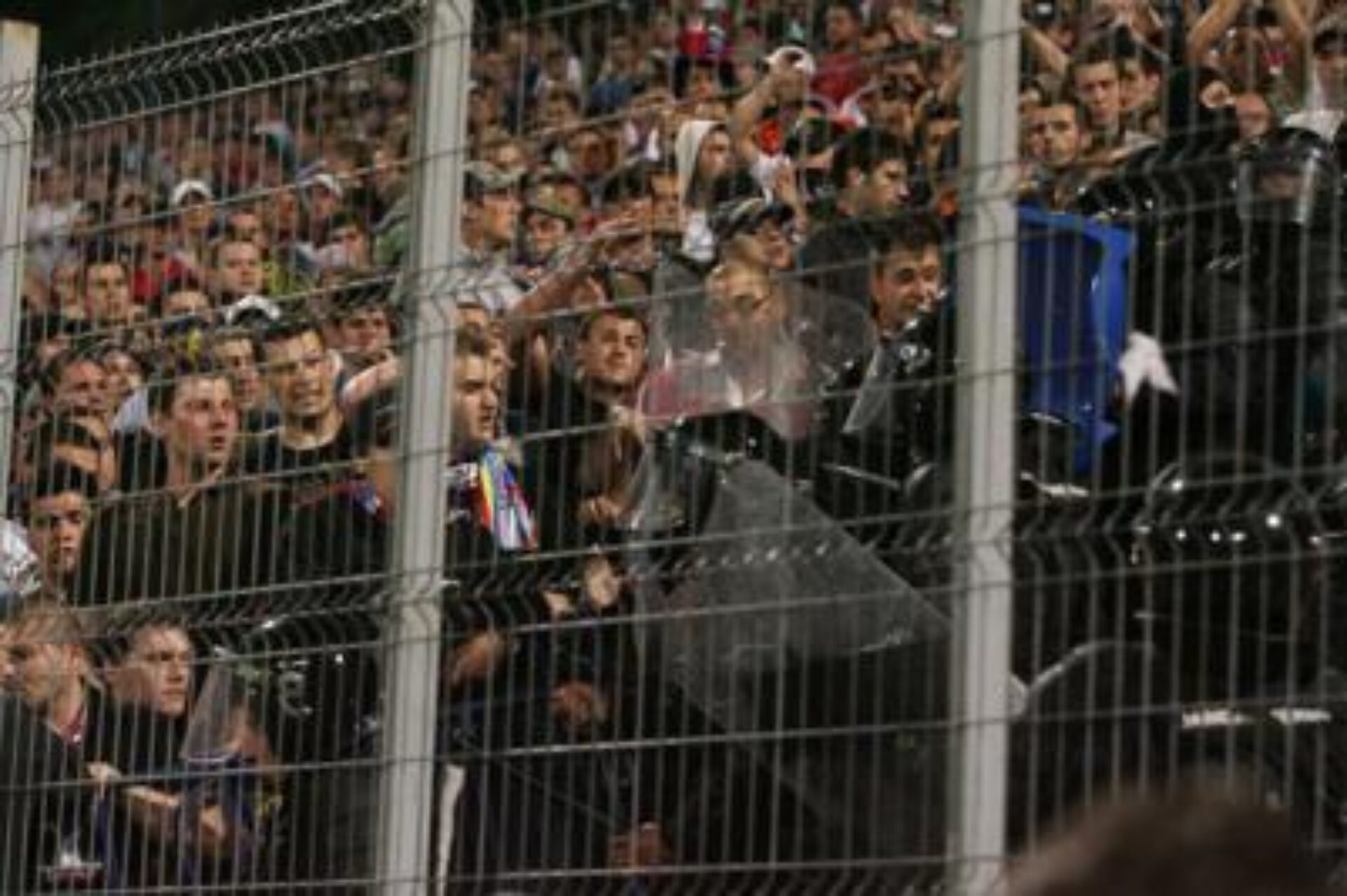 Din minutul 34, suporterii Stelei de la Peluza Sud au început să-i provoace pe fanii echipei Rapid, aruncând cu scaune și petarde în direcția acestora.