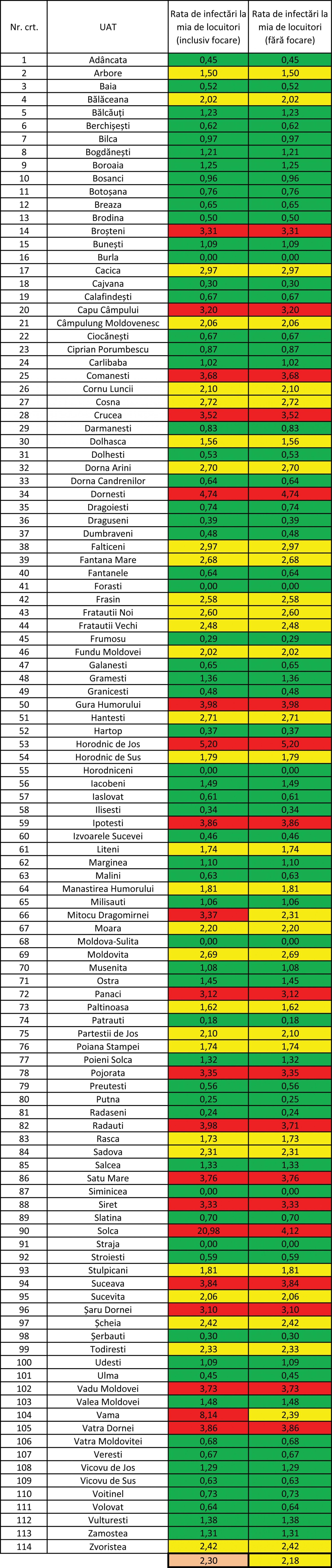 Cea mai mare rată de infectare din județ este în Solca, de 20,98 de cazuri Covid la mia de locuitori, aici fiind luați în calcul și bolnavii din focarul din acest oraș. Fără focarul de Covid, incidența cazurilor din orașul Solca este de 4,12. În Vama, rata de infectare este de 8,14 cu tot cu focarul de Covid de la centrul de bătrâni din această comună, însă scade la 2,39 dacă nu se iau în calcul bolnavii din această locație. Printre cele mai mari rate de infectare cu noul coronavirus din județ se înregistrează în localitățile Horodnic de Jos – 5,20, Dornești – 4,74, Gura Humorului – 3,98, Vatra Dornei și Ipotești – 3,86, Satu Mare – 3,76, Vadu Moldovei – 3,73, Rădăuți – 3,71 (fără focare) și 3,98 (cu tot cu bolnavii din focare) și Comănești – 3,68.
