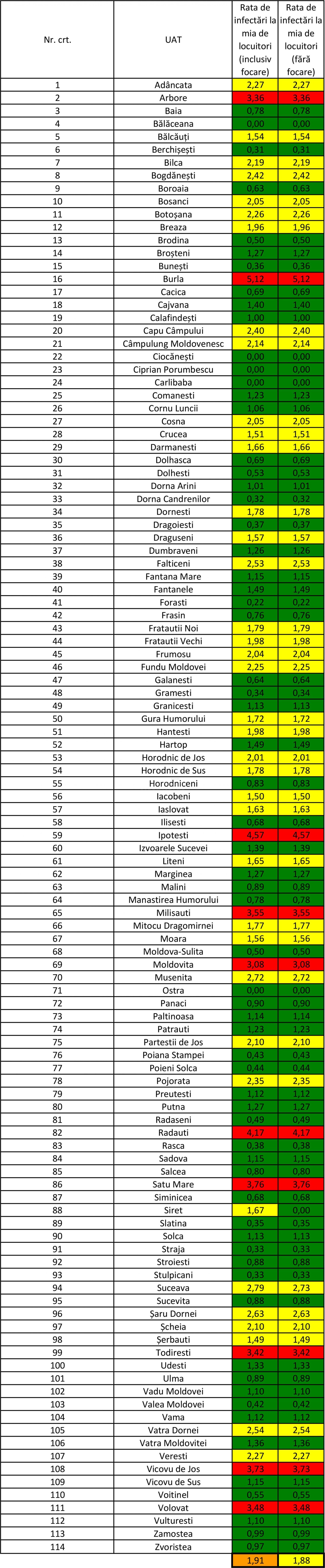Rata de infectare cu noul coronavirus a scăzut în ultimele 24 de ore atât la nivelul județului, cât și a municipiului Suceava. Astfel, la nivelul județului incidența cumulată la 14 zile a scăzut de la 1,91, cât a fost luni, la 1,88 de cazuri la mia de locuitori. În același timp, rata de infectare în municipiul Suceava a căzut ușor de la 2,80 la 2,73 de cazuri la mie, fără bolnavii din focare. Cu tot cu focare, rata de infectare din municipiul Suceava este, marți, de 2,79, tot în scădere față de luni.