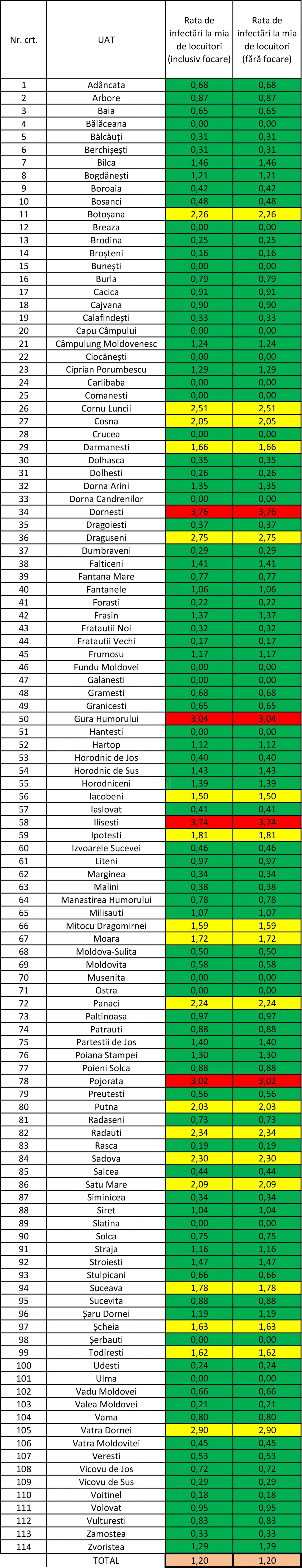 La aceeași dată în județ mai sunt localități în scenariul roșu, respectiv Dornești, cu o rată de infectare de 3,76, Gura Humorului – 3,04, Ilișești – 3,74 și Pojorâta – 3,02.