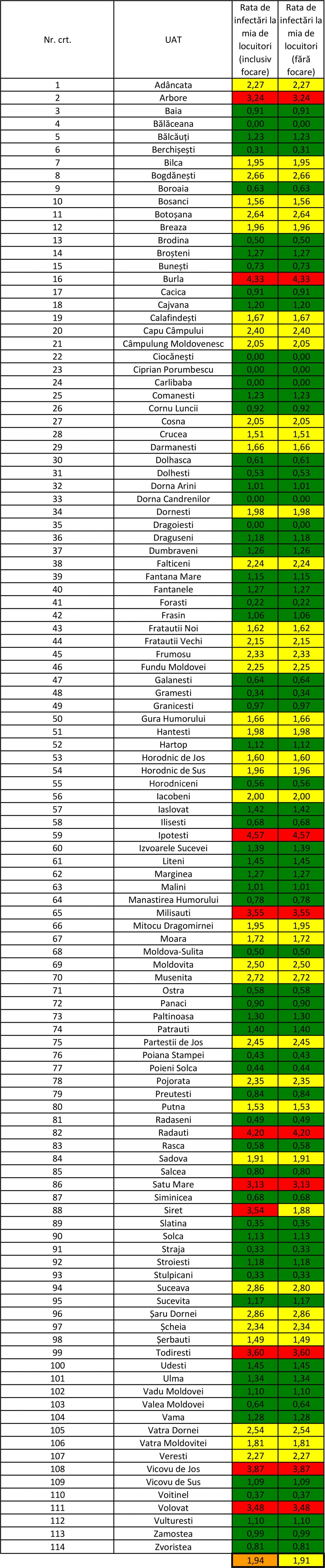 Rata de infectare cu noul coronavirus în municipiul Suceava a scăzut ușor în cursul zilei de astăzi. Din informarea oficială transmisă de Prefectura Suceava reiese că în cursul zilei de luni în Suceava se înregistrează o rată de infectare de 2,8 cazuri de Covid la mia de locuitori, fără focare, și de 2,86 cu tot cu bolnavii din focare. În cursul zilei de duminică incidența cazurilor de coronavirus din municipiul Suceava era de 2,85, fără focare, și de 2,91 cu tot cu focare.