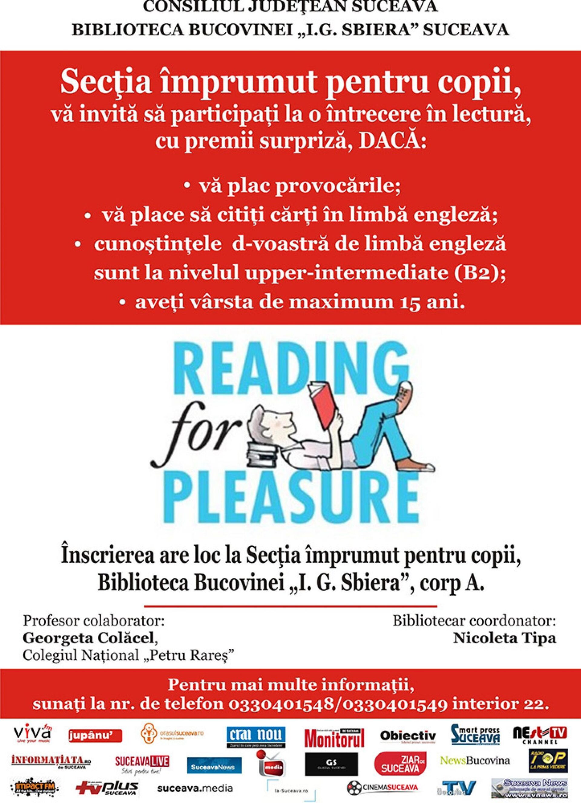 Biblioteca Bucovinei „I. G. Sbiera”, prin Secția împrumut pentru copii, a lansat proiectul „Reading for pleasure” și își propune să depășească tiparul clasic al unei biblioteci publice și să devină mai vizibilă în viața utilizatorilor săi, lansând o provocare la lectură iubitorilor limbii engleze, ale căror cunoștințe sunt la nivelul B2 (upper-intermediate).