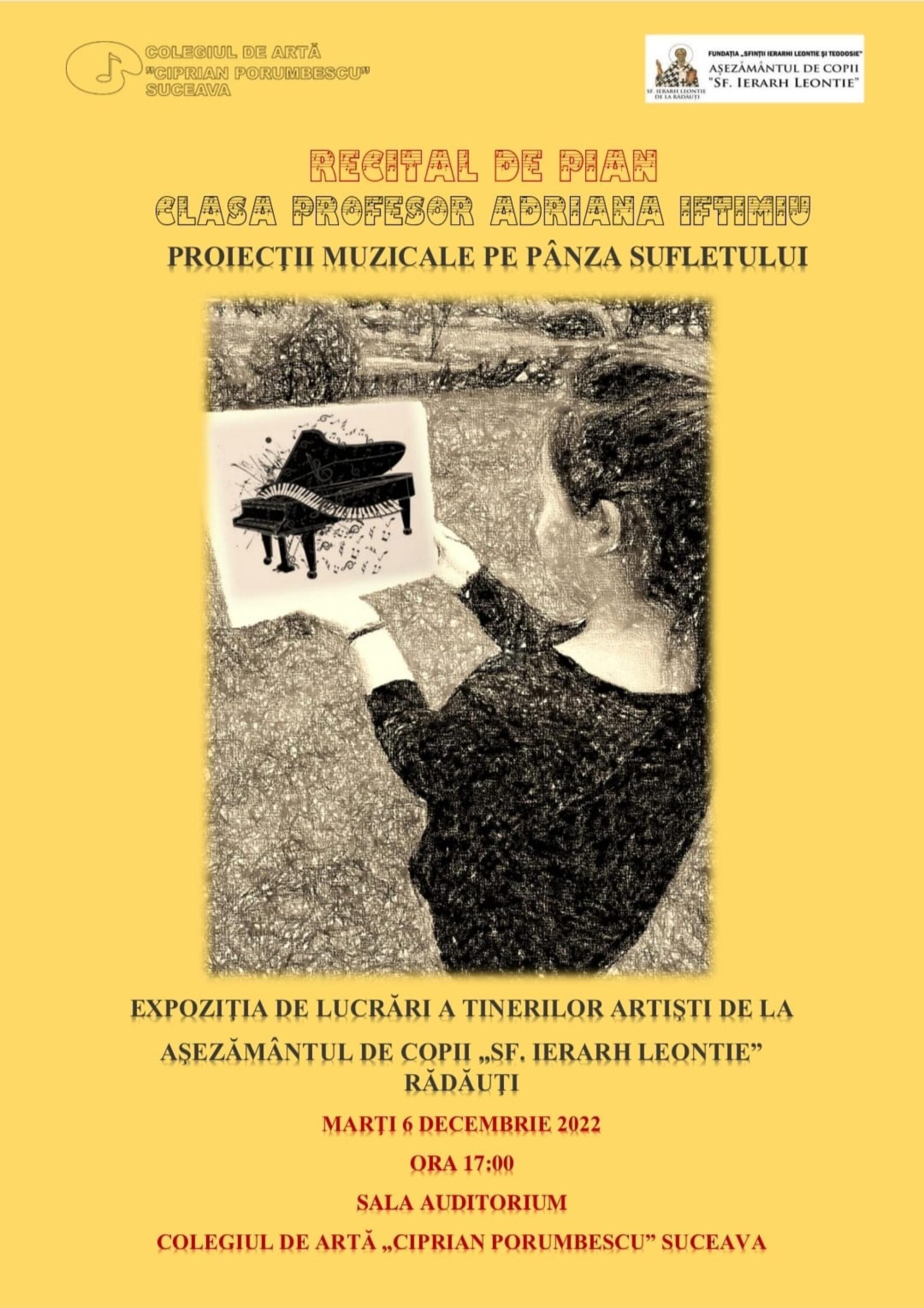 La Colegiul de Artă „Ciprian Porumbescu, Sala Auditorium, va avea loc marți, 6 decembrie, de la ora 17:00, recitalul „Proiecții muzicale pe pânza sufletului” al elevilor clasei de pian coordonată de prof. Adriana Teodora Iftimiu.