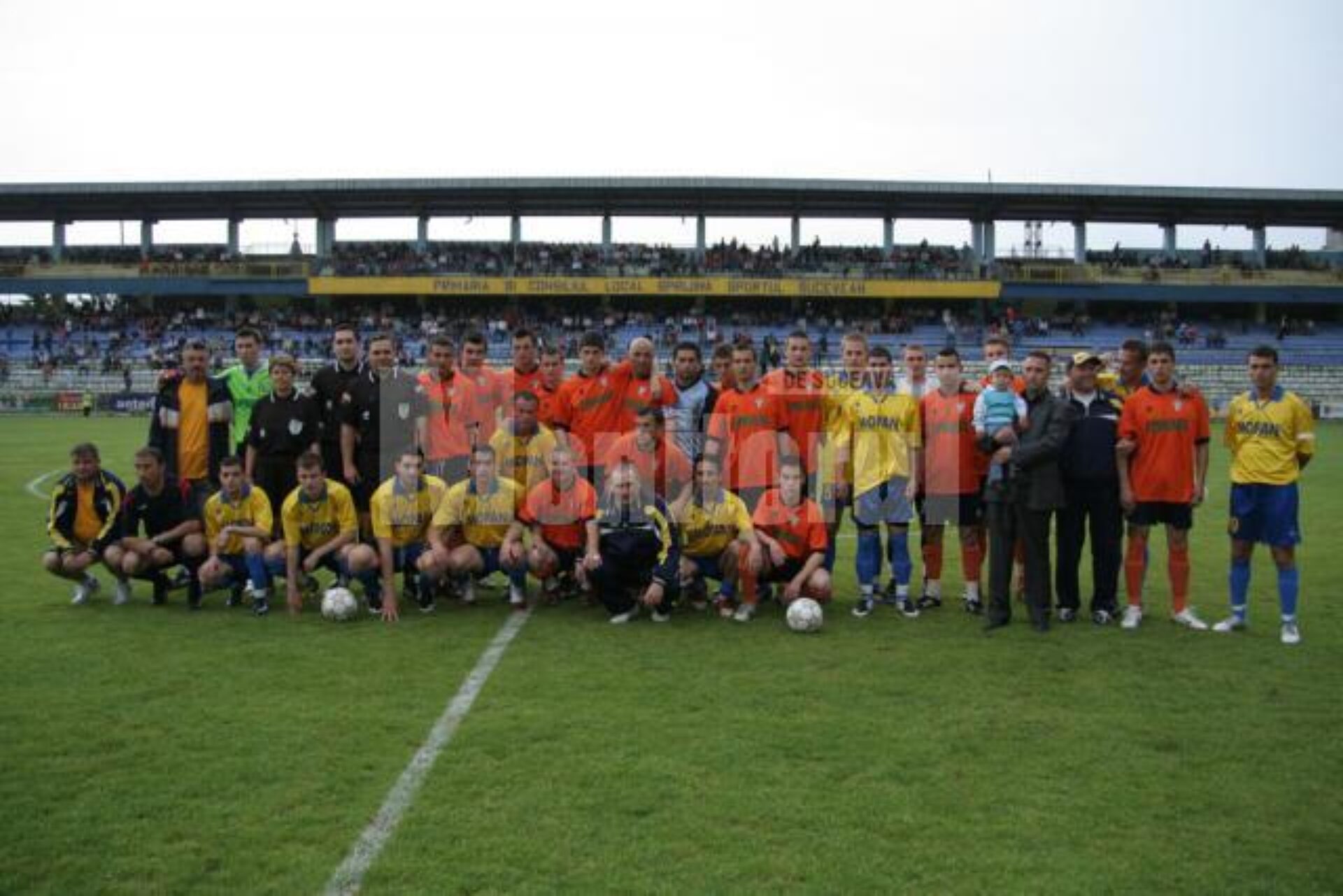 Peste 3.000 de suceveni au ținut să fie prezenți ieri, pe stadionul Areni, la evenimentul fotbalistic organizat pentru a sărbători promovarea echipei locale FC Cetatea Suceava în Liga a II-a. Cu această ocazie, fotbaliștii pregătiți de Marian Pană au disputat un meci amical în compania unei selecționate alcătuită din suceveni ce evoluează sau au evoluat în primul eșalon fotbalistic din România, echipă ce i-a avut pe banca tehnică pe Victor Gălușcă și Radu Cașuba. În aplauzele celor de pe teren, dar și suporterilor din tribune, lovitura de începere a meciului a fost dată chiar de mezinul antrenorului Marian Pană, în vârstă de doar un an și jumătate. După doar două minute de joc, stelele fotbalului sucevean reușesc să deschidă scorul prin Lucian Goian, cel care trimite balonul cu capul, din plonjon, după o centrare perfectă a lui Bălan, 0 – 1. Cu toate că au mai fost ocazii, până la pauză tabela a rămas neschimbată.