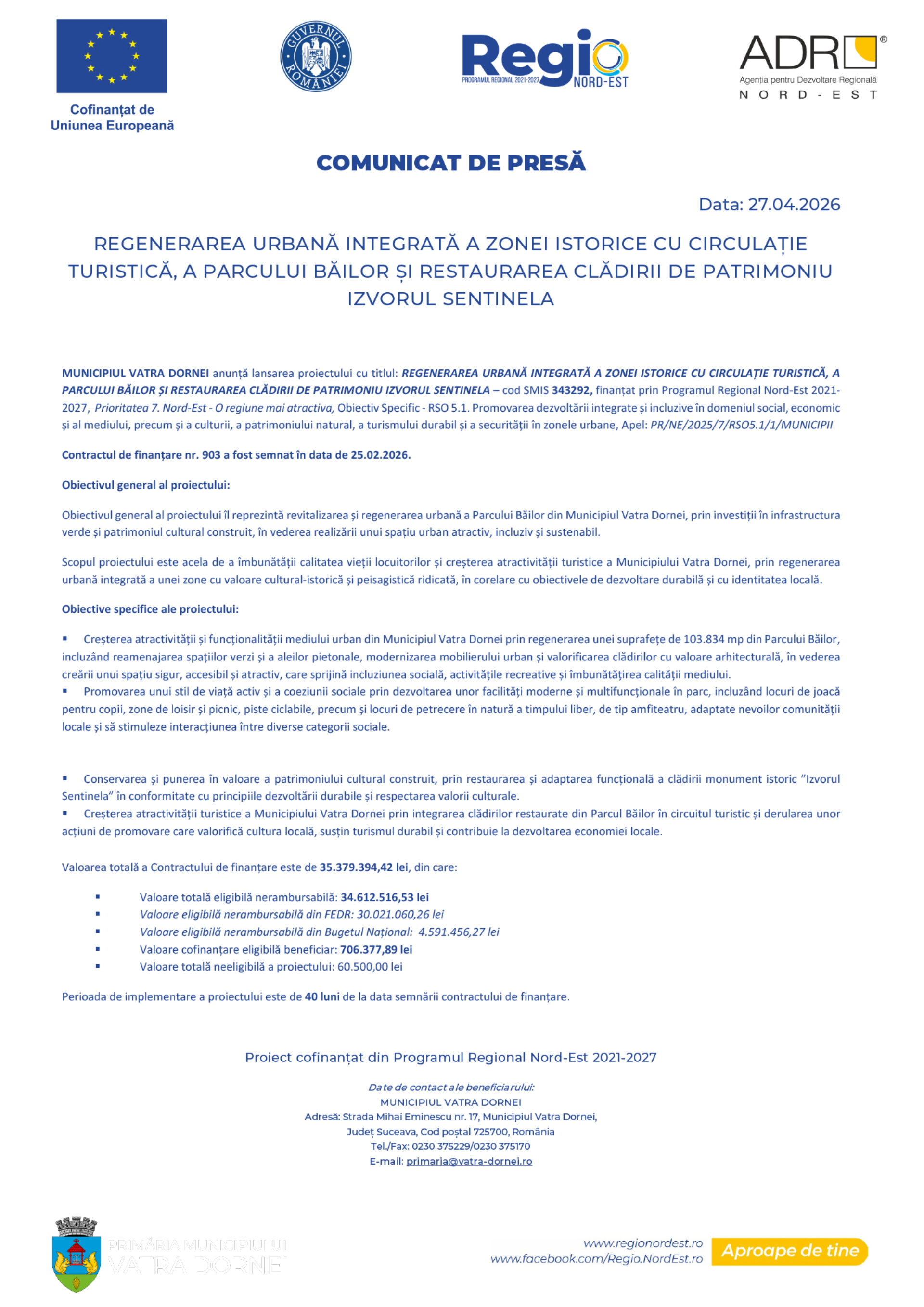 MUNICIPIUL VATRA DORNEI anunță lansarea proiectului cu titlul: REGENERAREA URBANĂ INTEGRATĂ A ZONEI ISTORICE CU CIRCULAȚIE TURISTICĂ, A PARCULUI BĂILOR ȘI RESTAURAREA CLĂDIRII DE PATRIMONIU IZVORUL SENTINELA – cod SMIS 343292, finanțat prin Programul Regional Nord-Est 2021-2027, Prioritatea 7. Nord-Est – O regiune mai atractiva, Obiectiv Specific – RSO 5.1. Promovarea dezvoltării integrate și incluzive în domeniul social, economic și al mediului, precum și a culturii, a patrimoniului natural, a turismului durabil și a securității în zonele urbane, Apel: PR/NE/2025/7/RSO5.1/1/MUNICIPII
