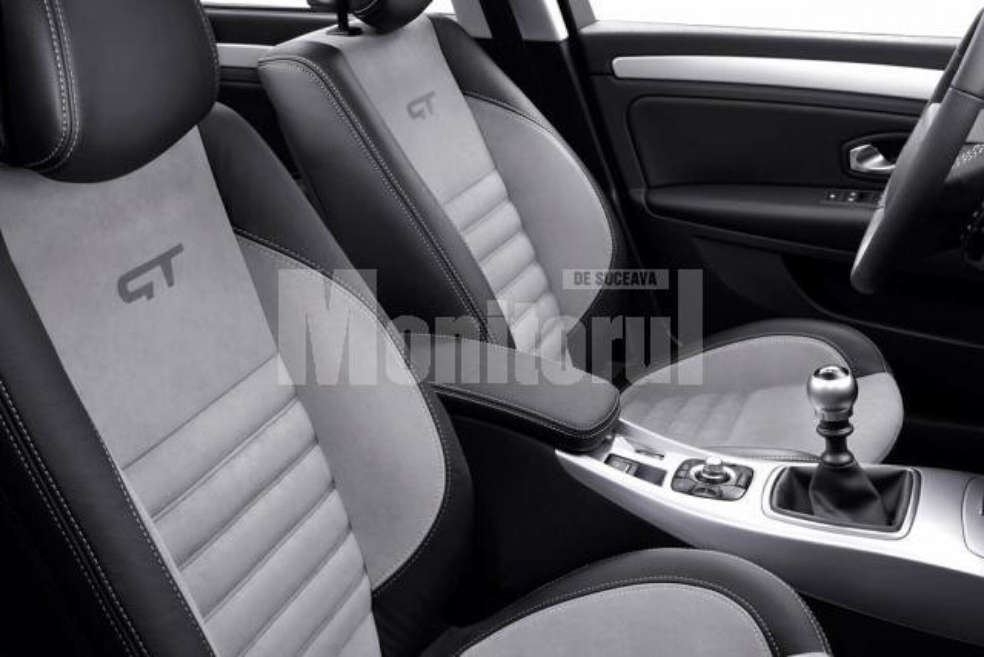 Emblema GT este afișată pe montantul B și scaune. Interiorul, îmbrăcat în cea mai mare parte în piele Alcantara, abundă în elemente sportive, de la pedalele perforate la levierul din aluminiu pentru schimbarea treptelor de viteză la volanul conceput special pentru Laguna GT.