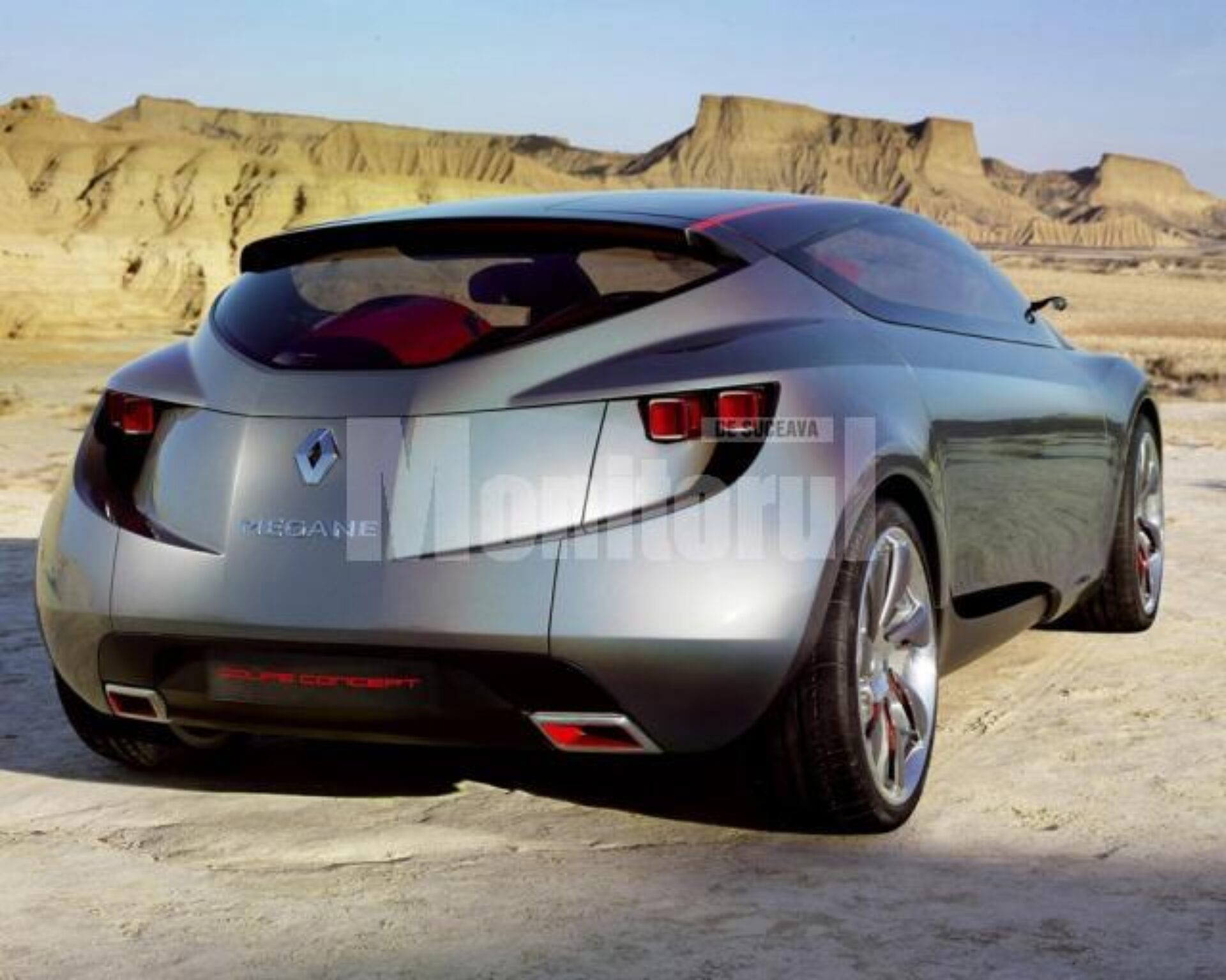 Misteriosul vehicul este Mégane Coupé Concept un prototip cu accente ușor futuriste care anticipează viitorul model de serie. Cu o lungime de 4.51 metri, prototipul afișează o siluetă modernă, dinamică cu linii care sugerează mișcare perpetuă. Exteriorul este axat în principal pe accentuarea caracterului dinamic și expunerea unui limbaj de design înțesat de linii sportive.