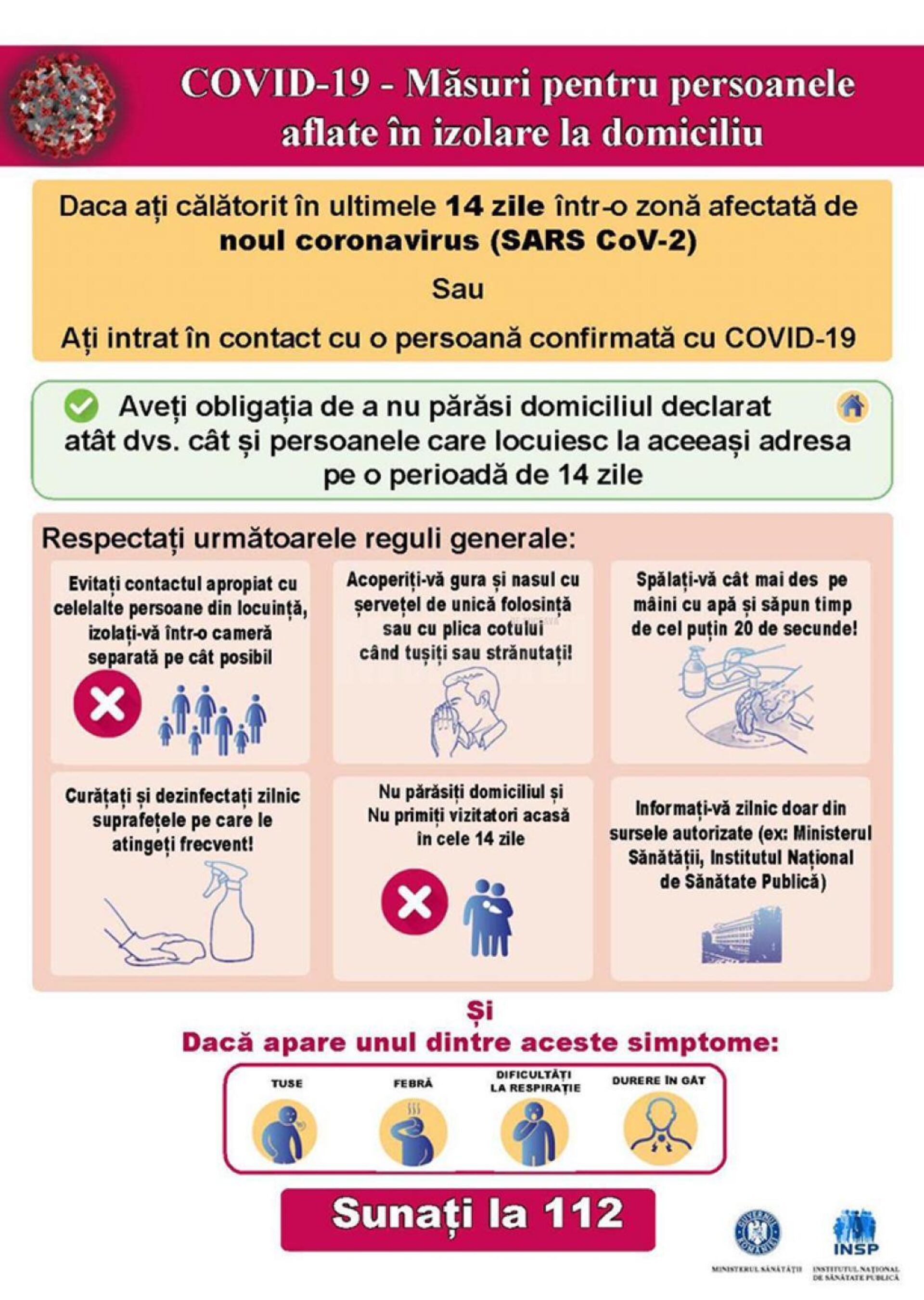Pe teritoriul României, în carantină instituționalizată sunt 107 persoane pentru care se efectuează verificări pentru a depista dacă au contactat noul coronavirus. Alte 11.505 persoane sunt în izolare la domiciliu și se află sub monitorizare medicală. Grupul de comununicare strategică a precizat, în informarea de presă, că până în prezent au fost înregistrate 19 dosare penale pentru infracțiunea de zădărnicirea combaterii bolilor, faptă prevăzută și pedepsită de art. 352 alin. 1 Cod Penal.