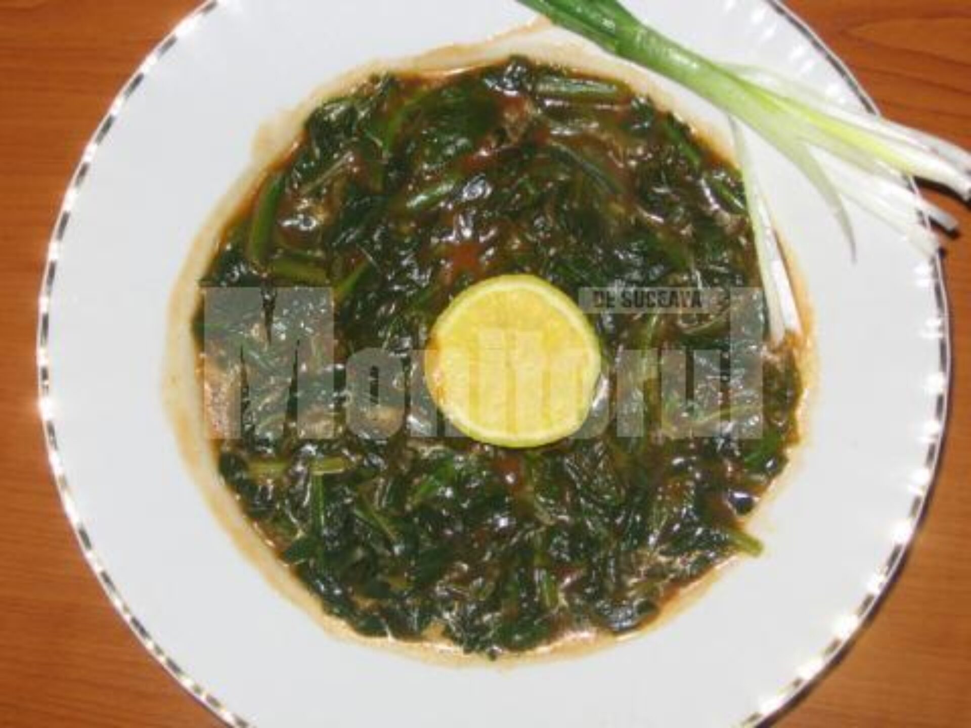 Se îndeasă capacul tigăii peste maldărul de spanac și se lasă cam 5 minute. Când spanacul își schimbă culoarea și devine verde viu, se adaugă o linguriță de sos de soia și una de pastă de tomate, se stoarce jumătate de lămâie peste, se mai gustă de piper sau sare.