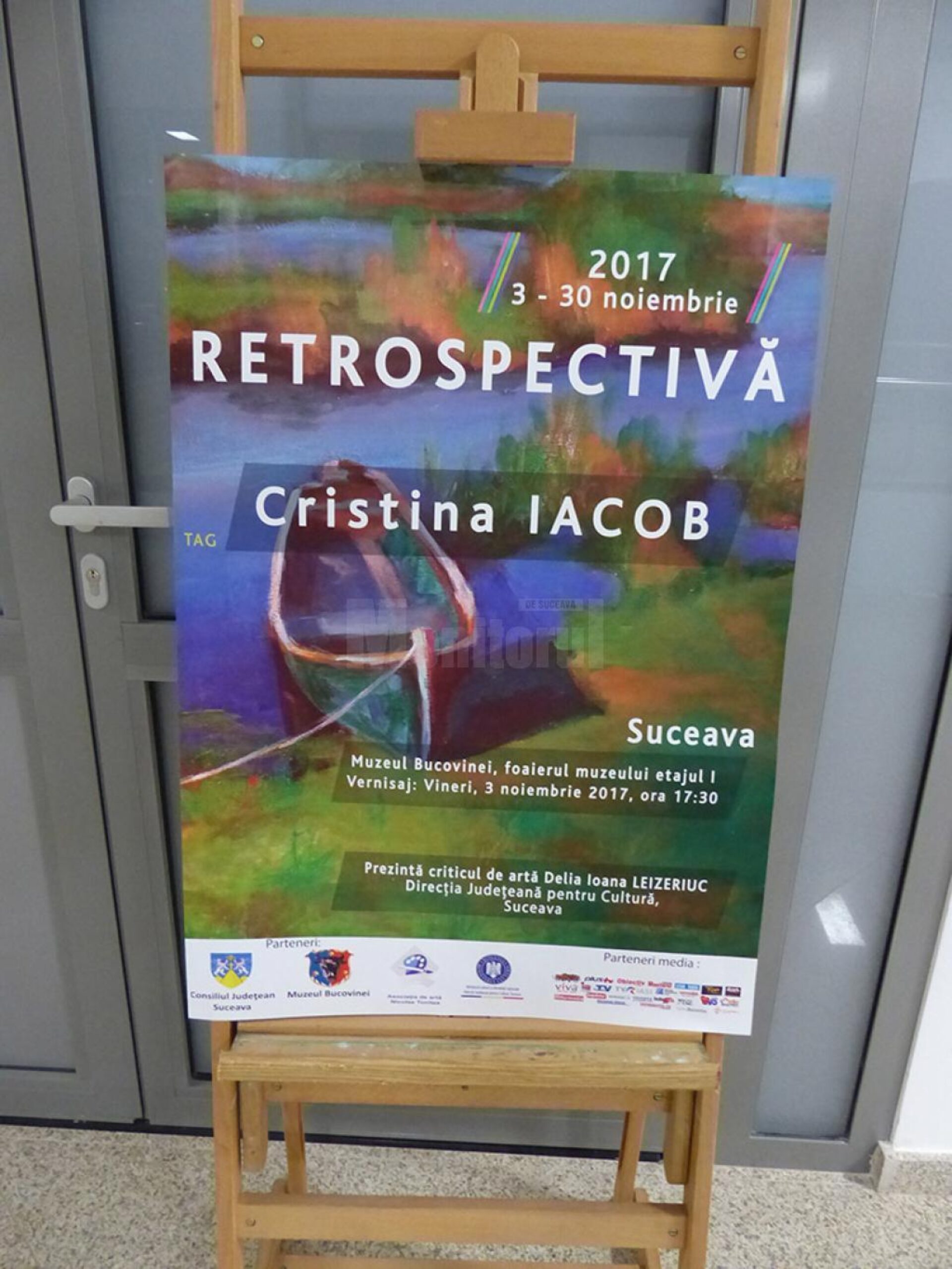 La Muzeul de Istorie Suceava a avut loc vineri, 3 noiembrie, prima expoziție personală de pictură a sucevencei Cristina Iacob, membră a Asociației de Artă „Nicolae Tonitza” (TAG – Tonitza Art Group), expoziție intitulată „Retrospectivă”. Artista a expus 22 de tablouri, unele deja aflate în expoziții personale, lucrări realizate în ulei pe pânzăde-alungul activității eiartistice, din 2005 și până acum. Cristina Iacob ne-a spus că expoziția sa este o colecție de stiluri și teme diferite. „În primele mele tablouri, sursa de inspirație au fost lucrările lui Salvador Dali, pictor spaniol, reprezentant de seamă al curentului suprarealist în artă. Ceva din el se regăsește și în tablourile mele”, a spus suceveanca. Un alt mare artist, care i-a fost Cristinei Iacob sursă de inspirație, a fost Sabin Bălașa. De asemenea, pictoriței îi place și expresivitatea chipurilor de țărani din pictura lui Octav Băncilă. Dintre pictorii contemporani, preferatul ei este David Croitor. „Sunt fascinată de casele pe care le pictează el, dar nu numai. Sunt fascinată de tot ce pictează și, da, el mi-a fost cumva o muză”, ne-a spus Cristina.