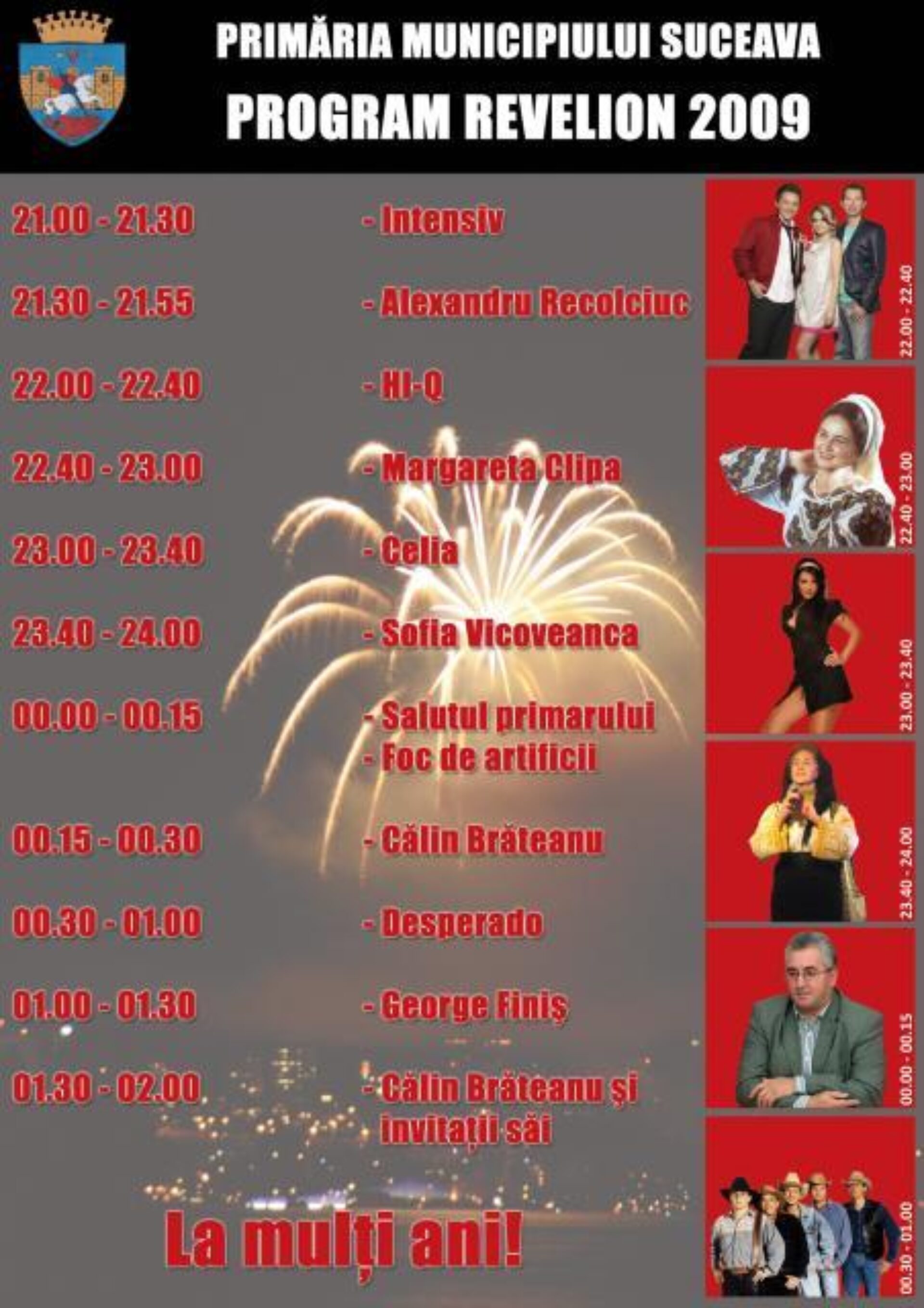 În noaptea dintre ani, în centrul Sucevei, timp de cinci ore, vor răsuna cântecele unor cunoscute formații și interpreți de muzică ușoară și populară, care vor marca astfel Revelionul în aer liber, devenit o tradiție de mai mulți ani. Programul de Revelion va fi deschis de un concert al trupei Intensiv, de la ora 21.00, urmat de un spectacol de muzică populară a interpretului sucevean Alexandru Recolciuc.