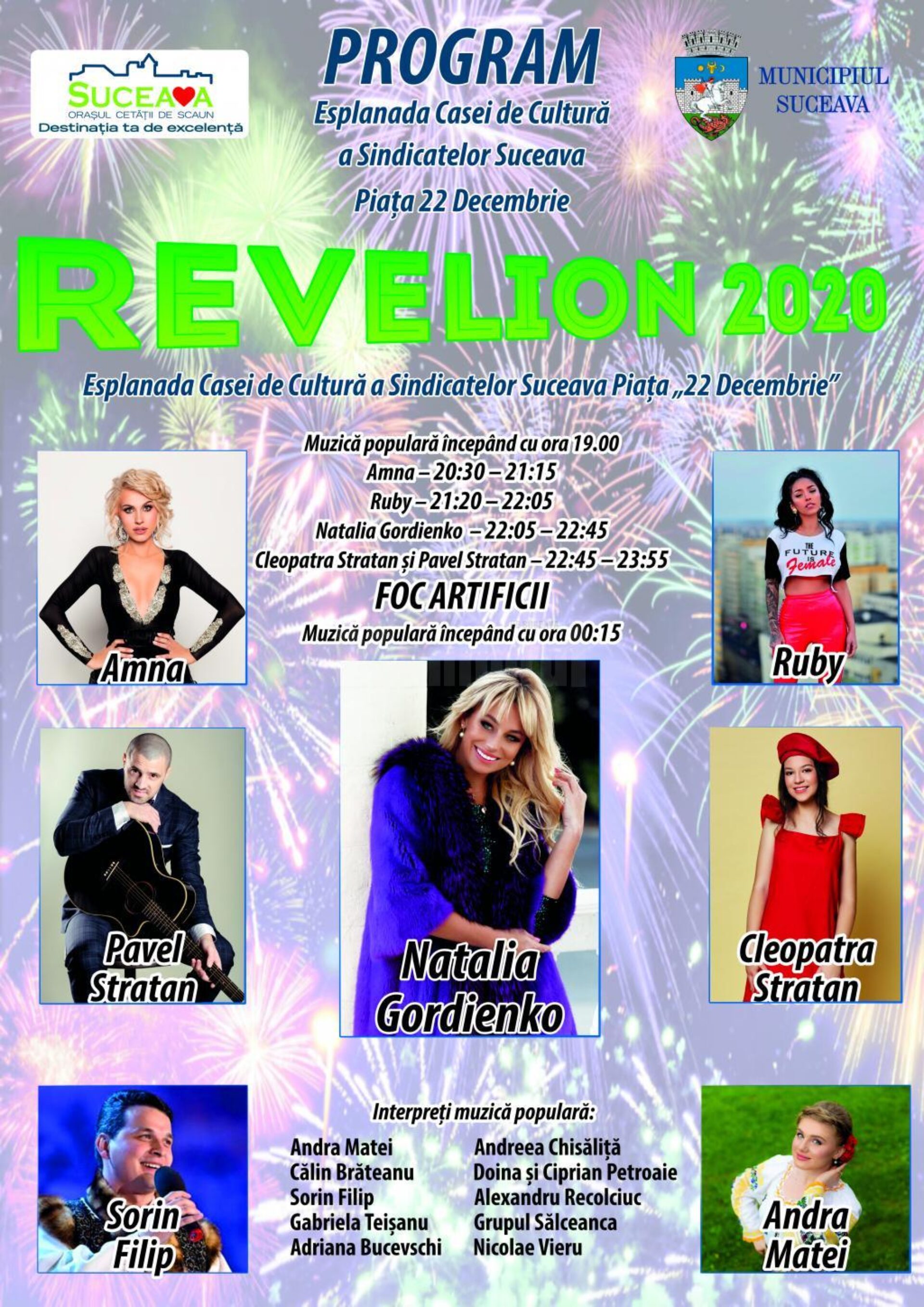 Programul special de Revelion, organizat în Piața 22 Decembrie, marți, 31 decembrie, începe de la ora 19.00, cu îndrăgiți interpreți de muzică populară: Andra Matei, Călin Brăteanu, Sorin Filip, Gabriela Teișanu, Adriana Bucevschi, Andreea Chisăliță, Doina și Ciprian Petroaie, Alexandru Recolciuc, Grupul Sălceanca și Nicolae Vieru.