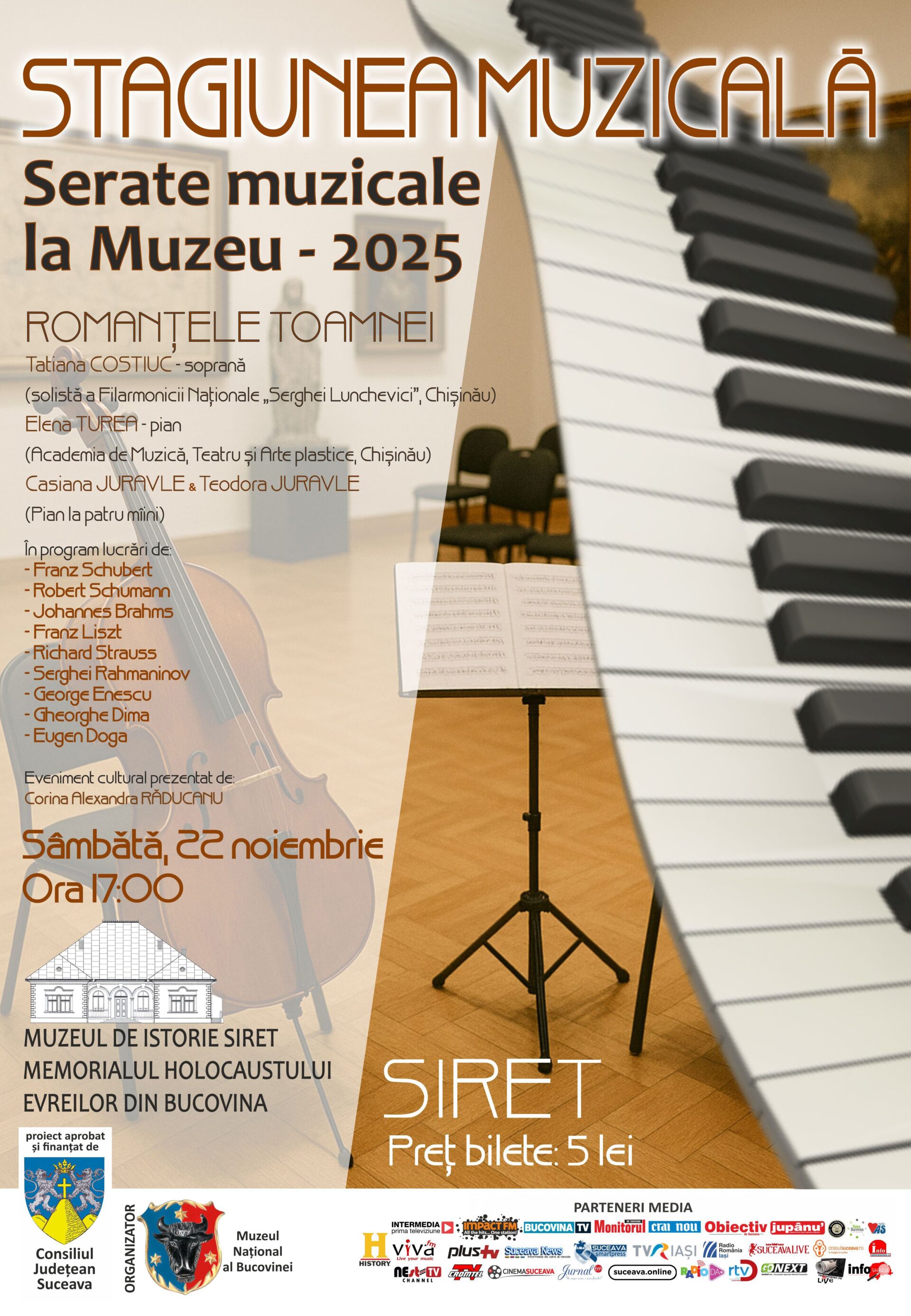La Muzeul de Istorie Siret – Memorialul Holocaustului Evreilor din Bucovina va avea loc sâmbătă, 22 noiembrie 2025, începând cu ora 17:00, evenimentul cultural „Romanțele toamnei”.