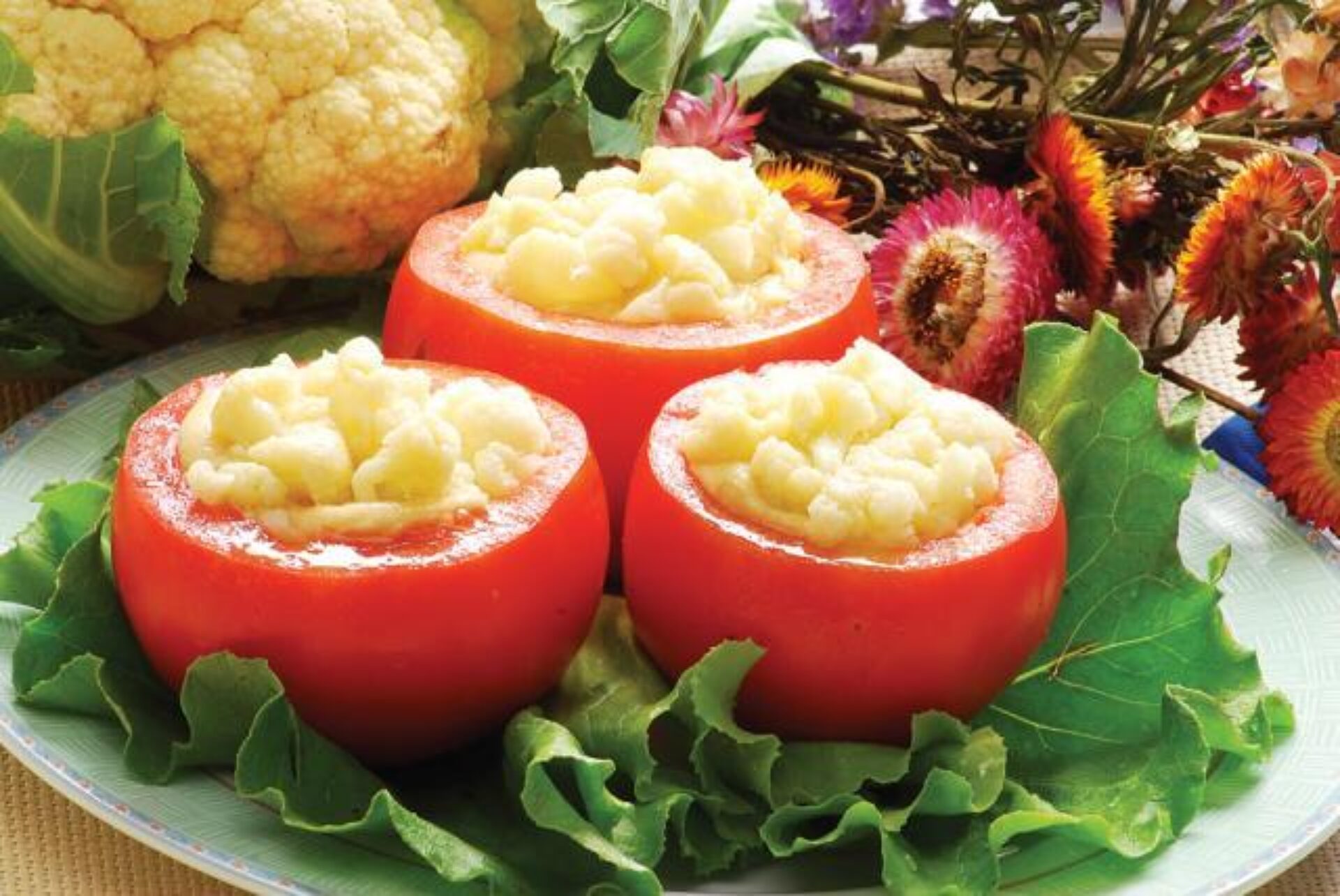 Cartofii curățați fierbeți-i și faceți din ei un piure. Puneți în piure muștarul și faceți o maioneză, adăugând uleiul puțin câte puțin. Puneți conopida mărunțită în maioneza de cartofi și cu acest amestec umpleți roșiile. Presărați pe deasupra verdeața tocată mărunt.