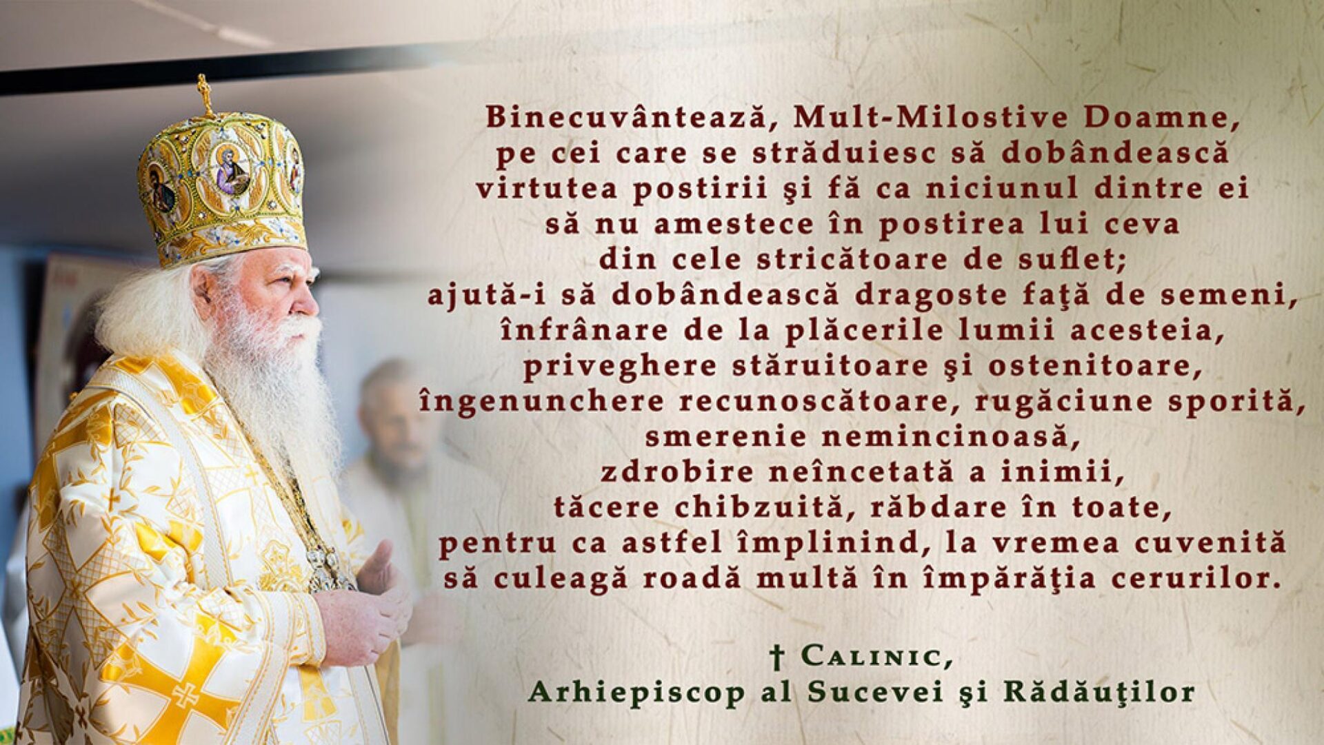 Doamne Iisuse Hristoase, Dumnezeul nostru, Cel ce ai pus cea dintâi cunună a biruinței pe creștetul firii omenești, după 40 de zile de post și rugăciune în pustiul Carantaniei, și ai dăruit lumii postul drept armă puternică împotriva demonilor, patimilor și păcatelor de tot felul, pe Tine Te rugăm, binecuvântează postul care începe, ca să fie robilor Tăi început al nevoințelor trupești și sufletești, întărire a toată virtutea, luminător al sufletului și al trupului, curăție a rugăciunii, curmare a poftelor de tot felul, înmuiere a împietririi inimii, început și învățător al liniștirii, străjer al ascultării, sănătate a trupului, pricinuitor al nepătimirii, izvor al neprihănirii, rod al mântuirii, ușă a raiului, cunună a sfințeniei și înaintemergătorul tuturor faptelor bune.