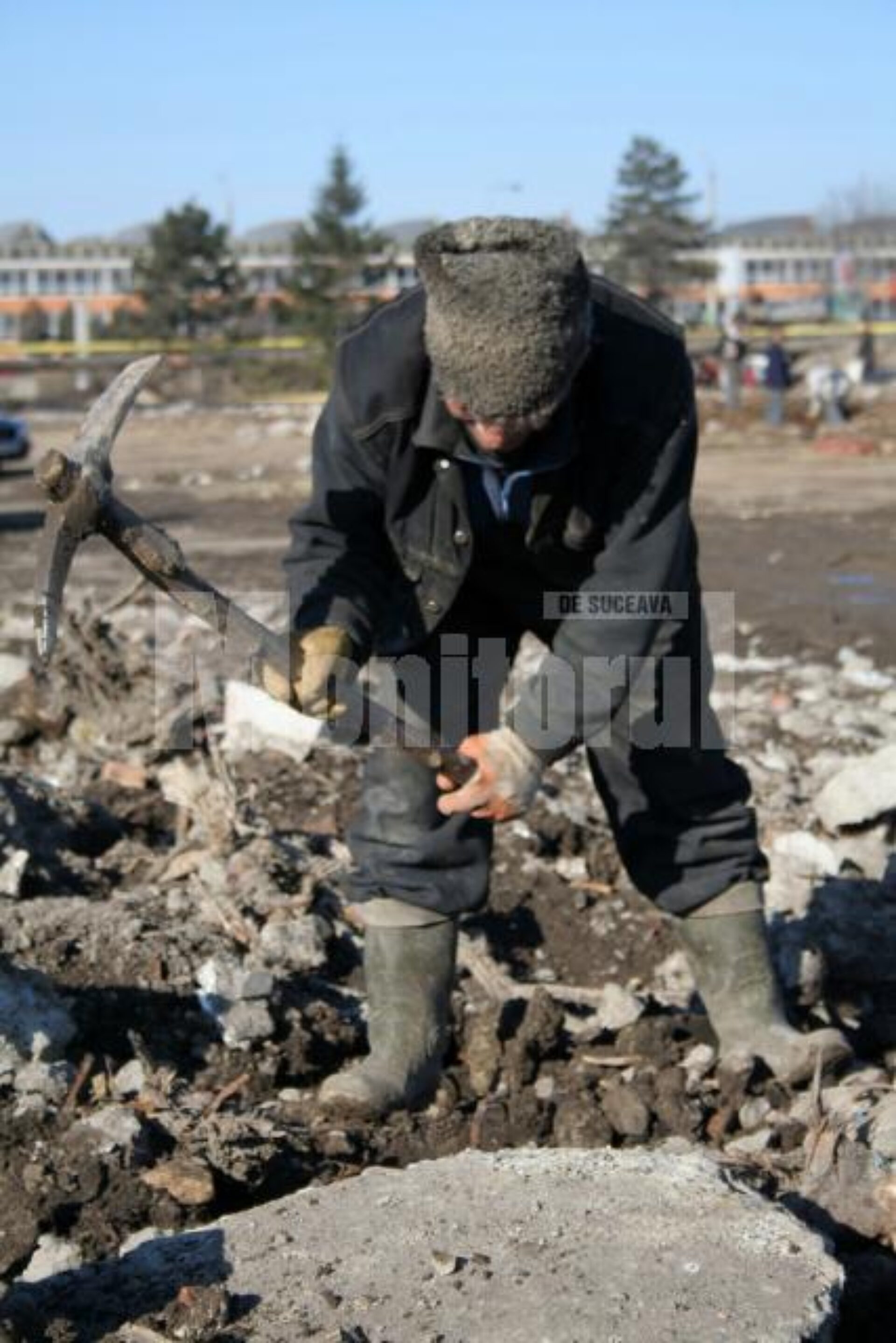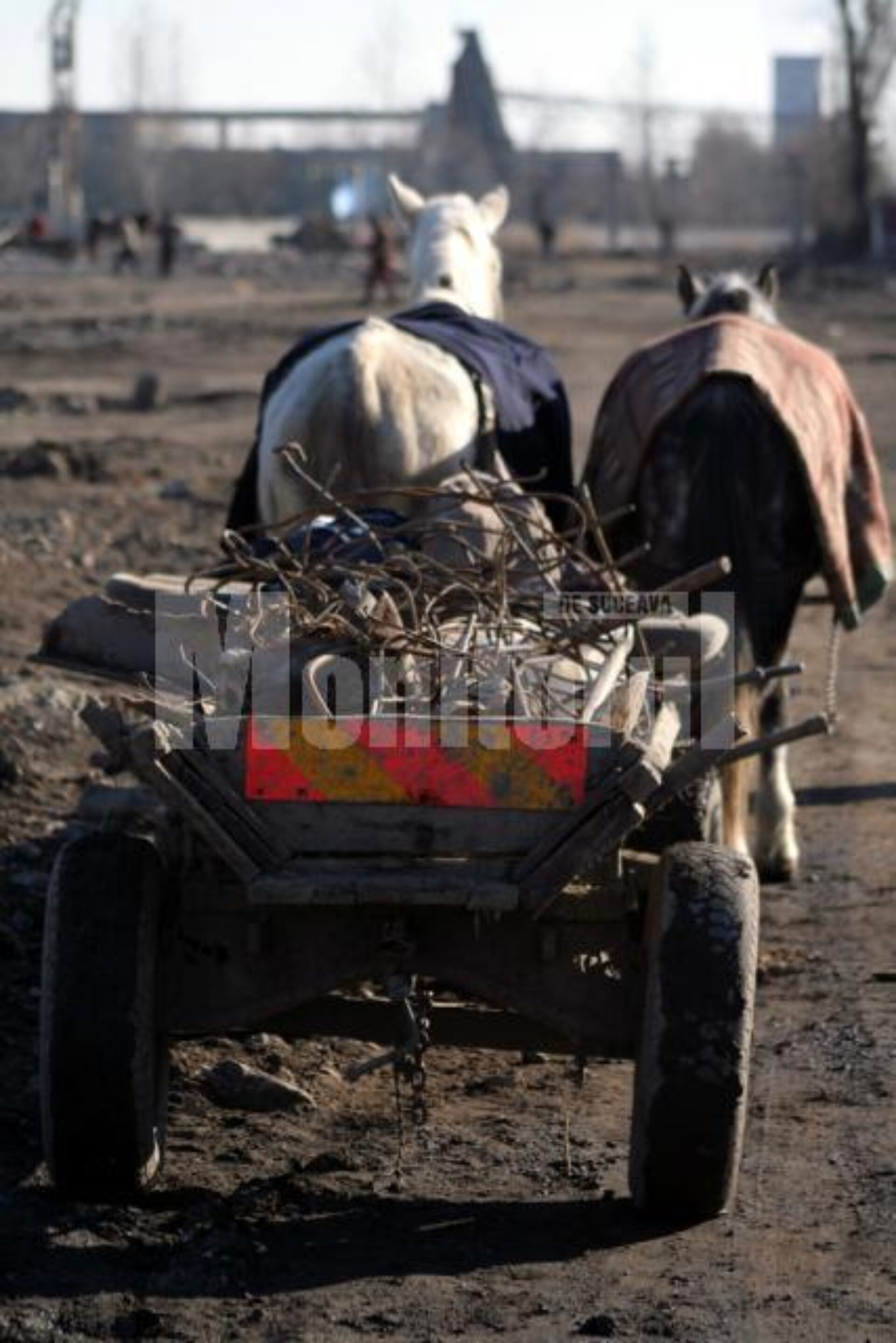 Fierul e pâinea lor. Pe fiecare kilogram de fier pe care reușesc să-l adune, obțin de la centrele de colectare 0,6 lei, bani munciți. Pentru bani au venit de dimineață, cu căruțele trase de gloabe înfometate, care se uită disperate după un colț de iarbă printre mormanele de moloz. Pentru banii pe care îi pot obține într-o zi, din vânzarea a câteva zeci de kilograme, dau la târnăcop până îi dor mușchii și își rup unghiile în colțurile ascuțite ale bolovanilor de ciment, din care smulg prețioasele bucăți de metal.
