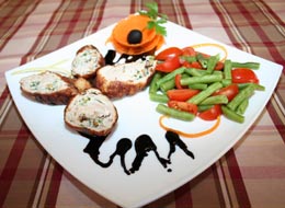 4. Se scot ruladele de curcan din sos și acesta se condimentează după gust cu sare, piper și boia. Pe farfurii se așează ruladele de curcan cu sos și garnitura de fasole verde.